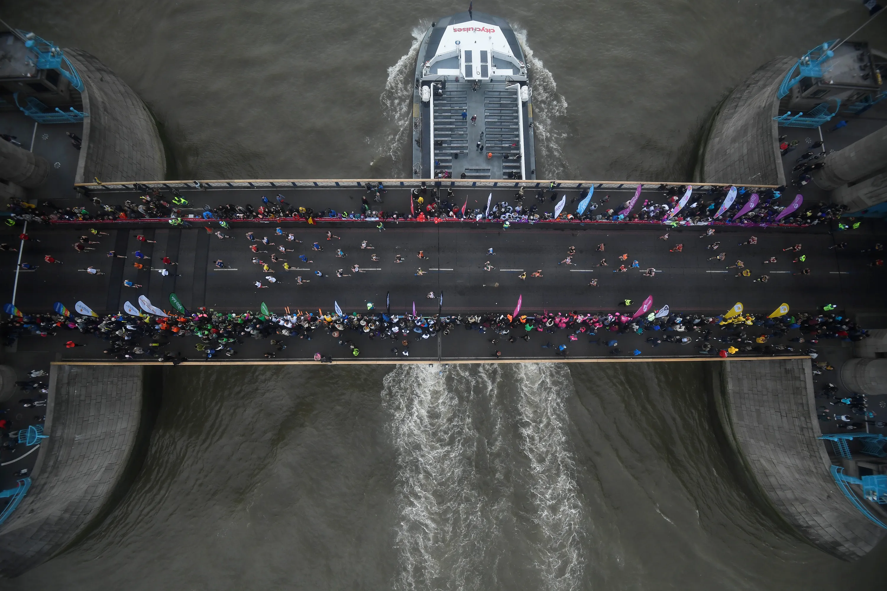 Runners of the London Marathon are seen from Tower Bridge’s Glass Floor during the Virgin Money London Marathon at United Kingdom on April 28, 2019 in London, England. (Photo by Toby Melville/Reuters)