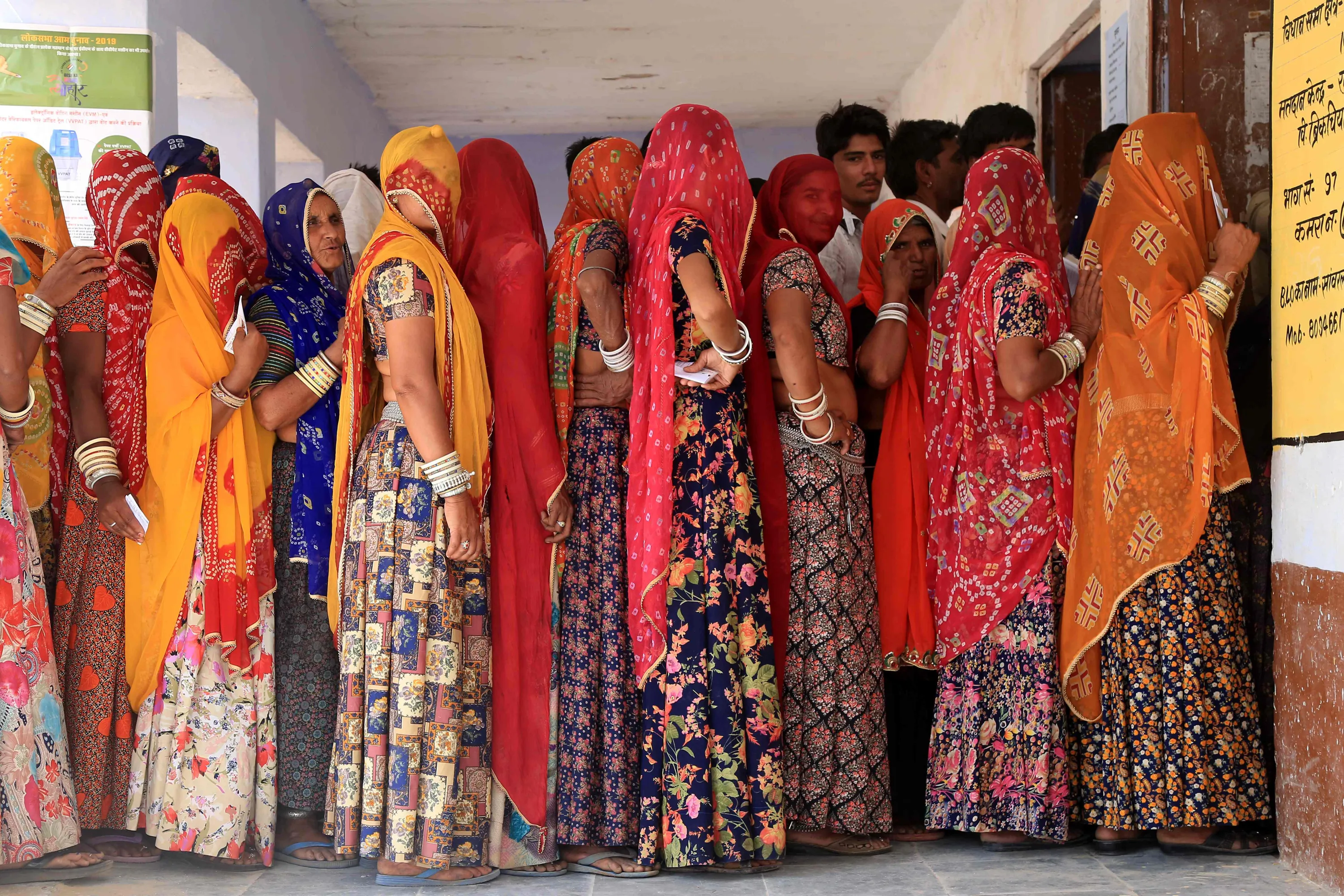 Indian voters stand in a queue to cast their vote at a polling station for the fourth phase of India's general elections in the outskirts of Ajmer, in the Indian state of Rajasthan, on April 29, 2019. Voting began for the fourth phase of India's general parliamentary elections as Indians exercise their franchise in the country's marathon election which started on April 11 and runs through to May 19 with the results to be declared on May 23. (Photo by Himanshu Sharma/AFP Photo)