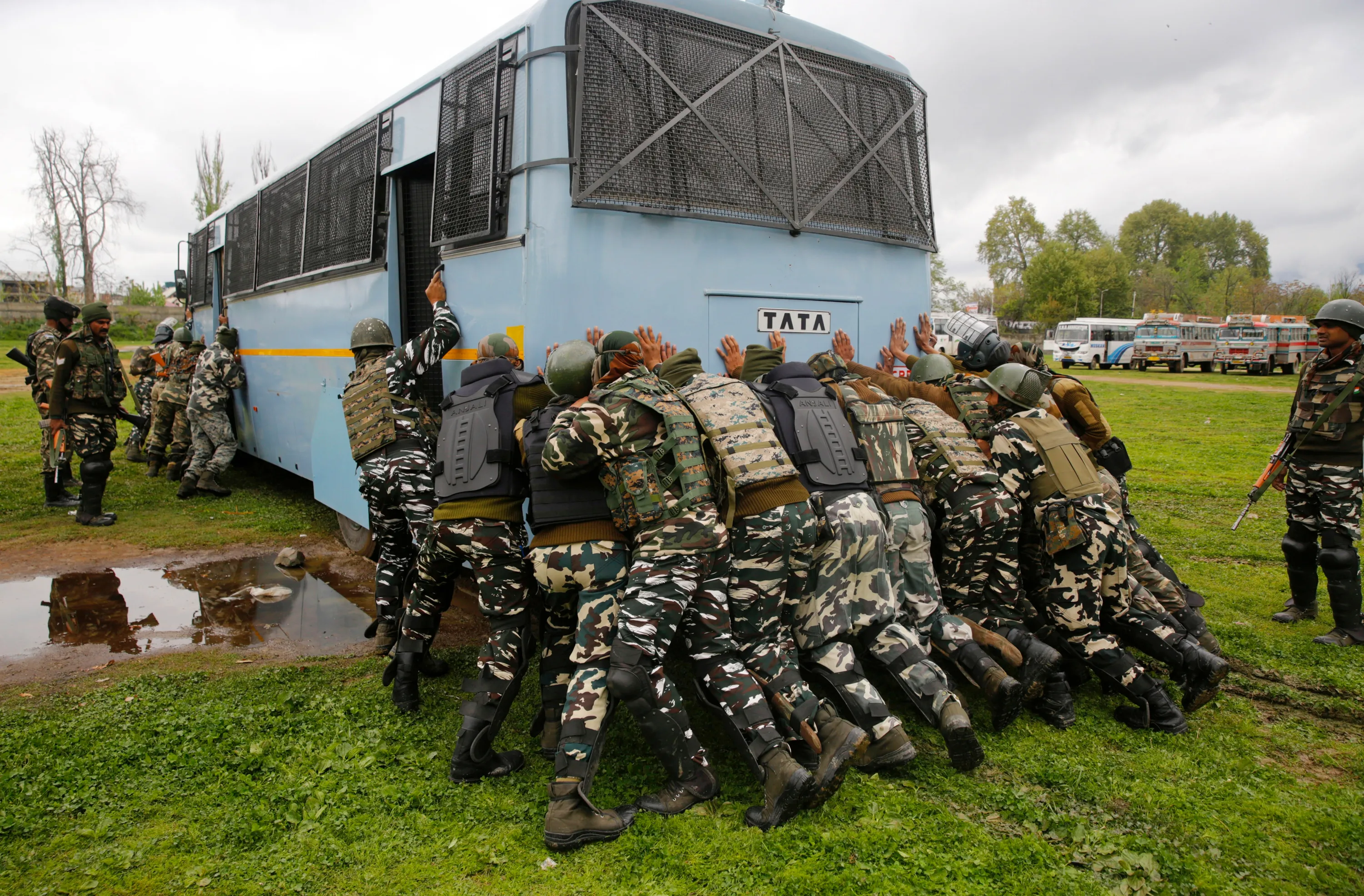 Indian paramilitary soldiers push their bus that was caught in mud at a polling equipment distribution center in Srinagar, Kashmir, India, 17 April 2019. The elections for Srinagar parliament constituency are scheduled to be held on 18 April 2019. The parliament elections which began on 11 April 2019 are to be conducted in seven phases throughout India. (Photo by Farooq Khan/EPA/EFE)