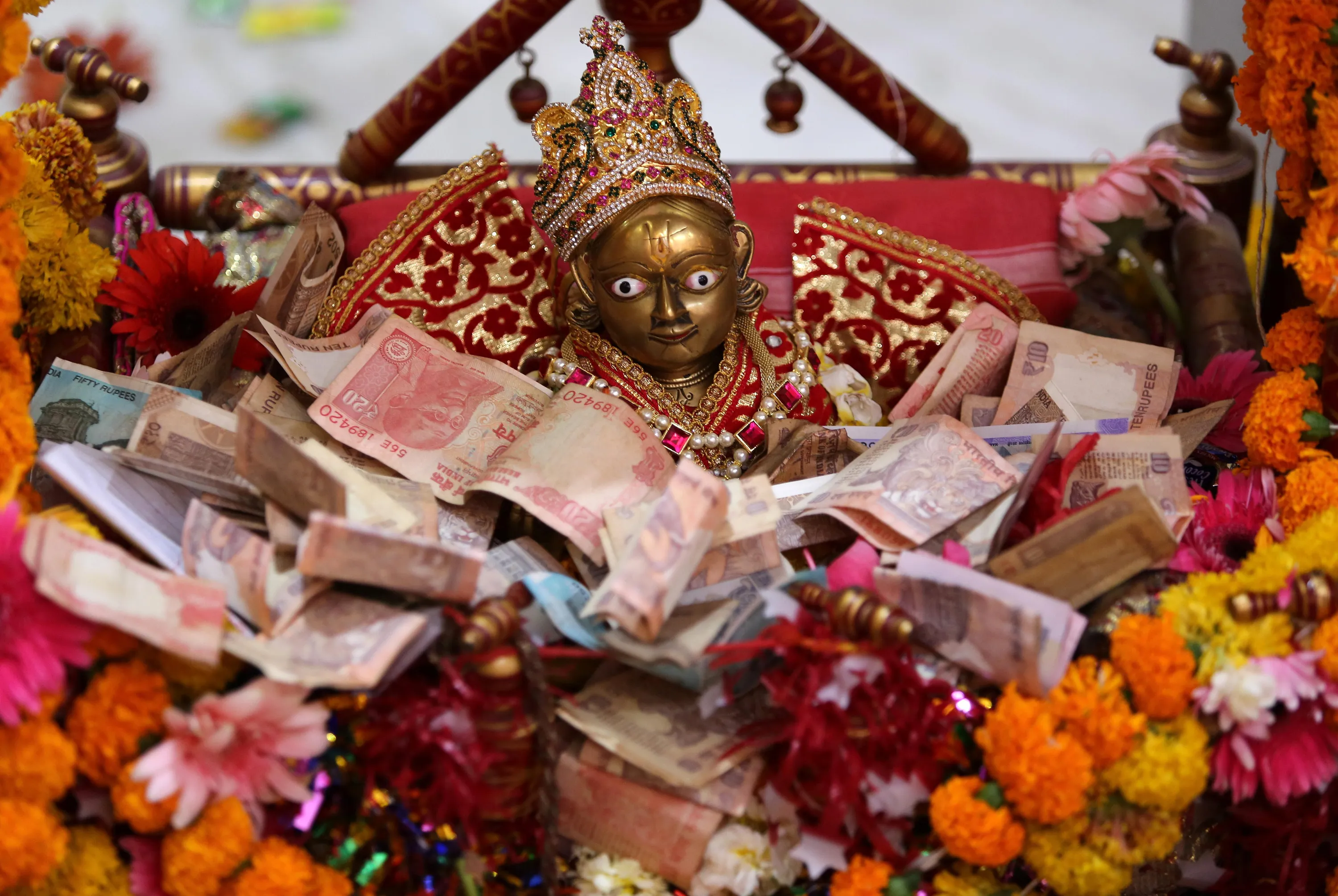 Indian rupee notes are kept in front of an idol of Hindu Lord Rama as offerings by devotees, during Ramnavmi festival at a temple in Ahmedabad, India, April 14, 2019. (Photo by Amit Dave/Reuters)
