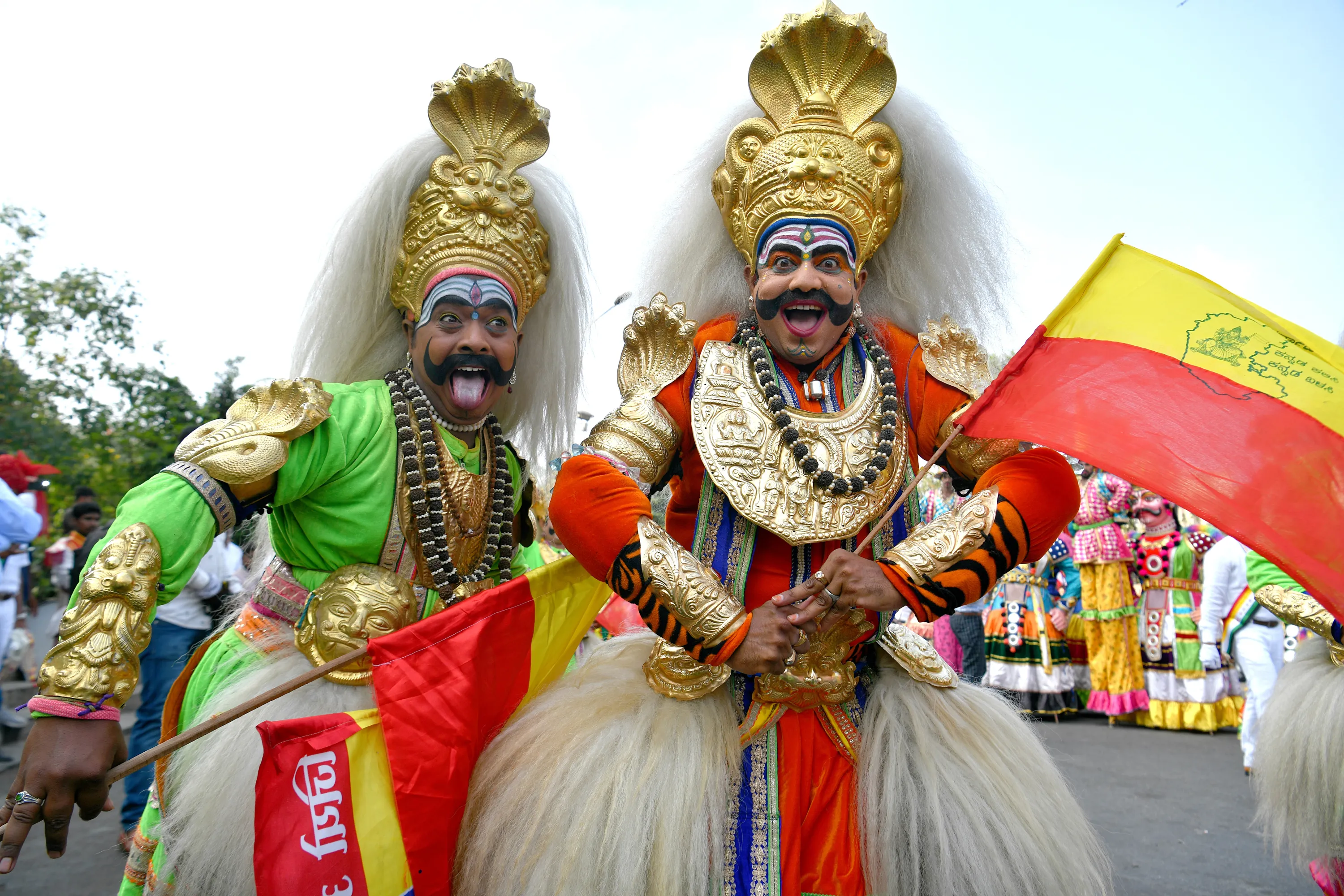 “Veeragase” folk artists of Karnataka dressed as deities take part in a rally during “Mahaveer Jayanthi” festival celebrations, in Bangalore on April 17, 2019. “Mahavir Jayanti” is one of the most auspicious festivals for the Jain community which is celebrated to commemorate the birth anniversary of Lord Mahavira, the 24th and the last “Thirthankara” of Jainism. (Photo by Manjunath Kiran/AFP Photo)