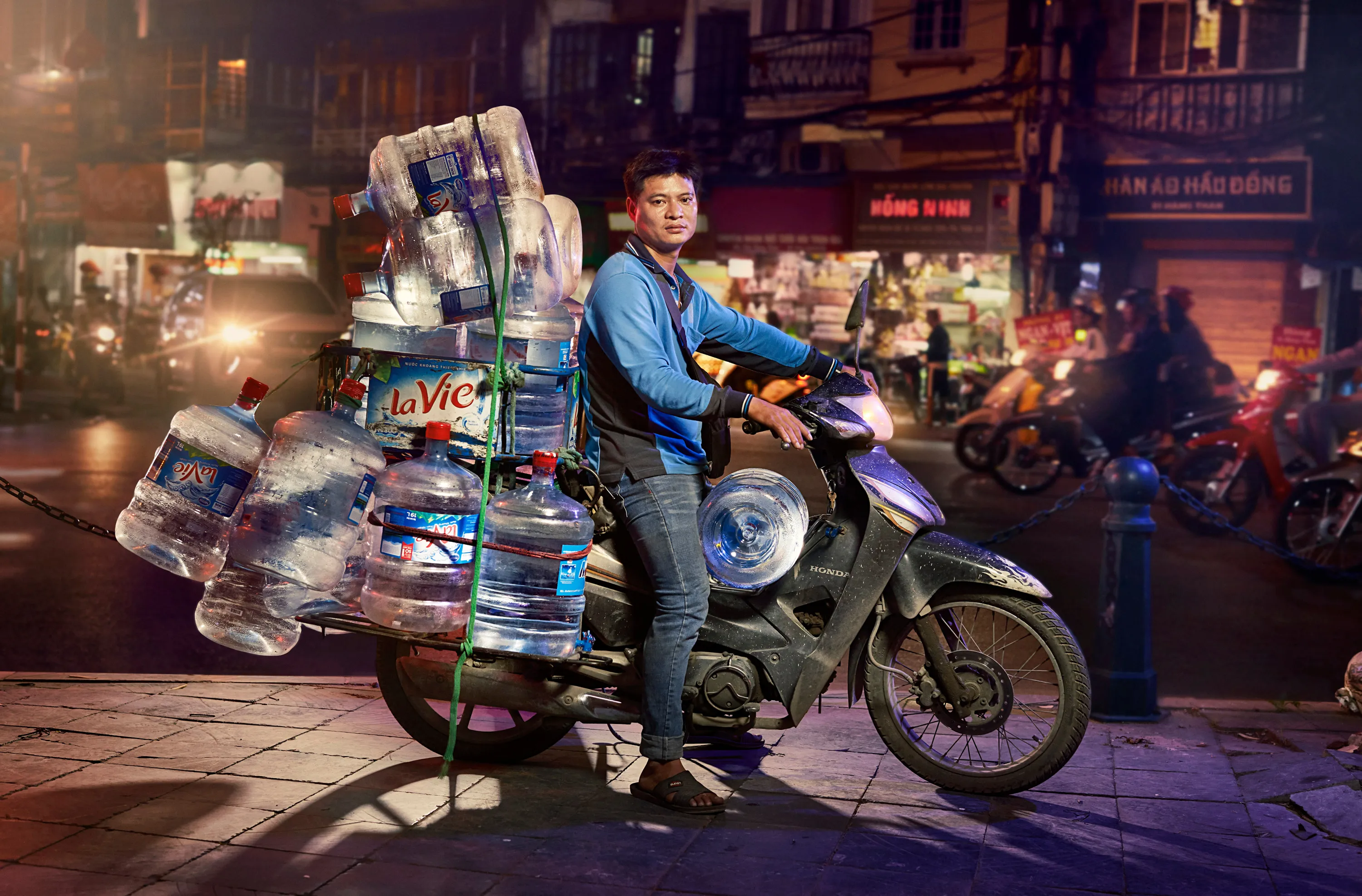 Water for office workers. “There is such a skill to loading up a motorbike to this level, and knowing what your limits are, and then on top of that, getting to your destination with a full undamaged load”. (Photo by Jon Enoch/The Guardian)