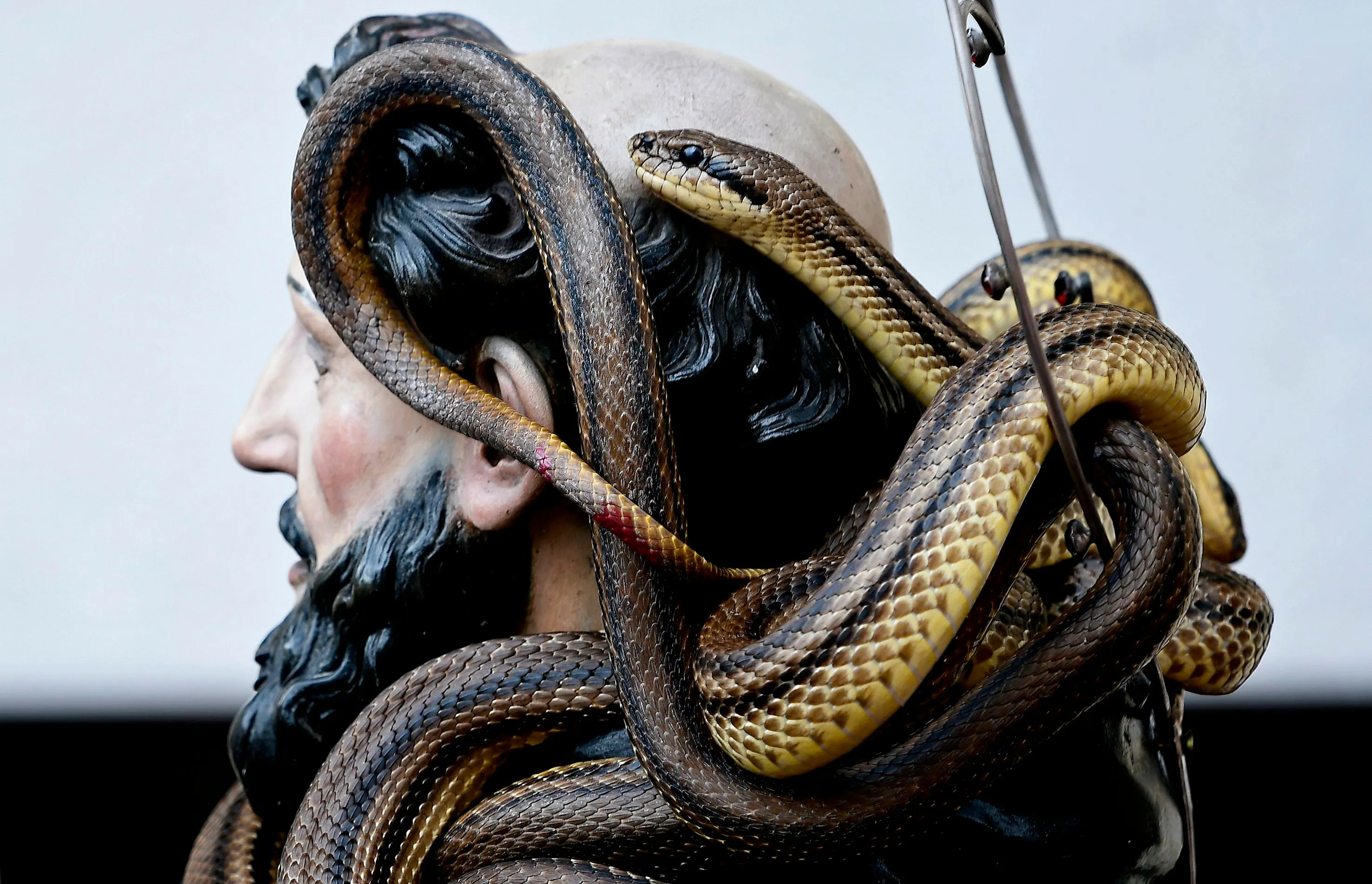 A statue of Saint Domenico covered with live snakes is carried by faithfuls during an annual procession in the streets of Cocullo, a small village in the Abruzzo region, on May 1, 2019. (Photo by Filippo Monteforte/AFP Photo)