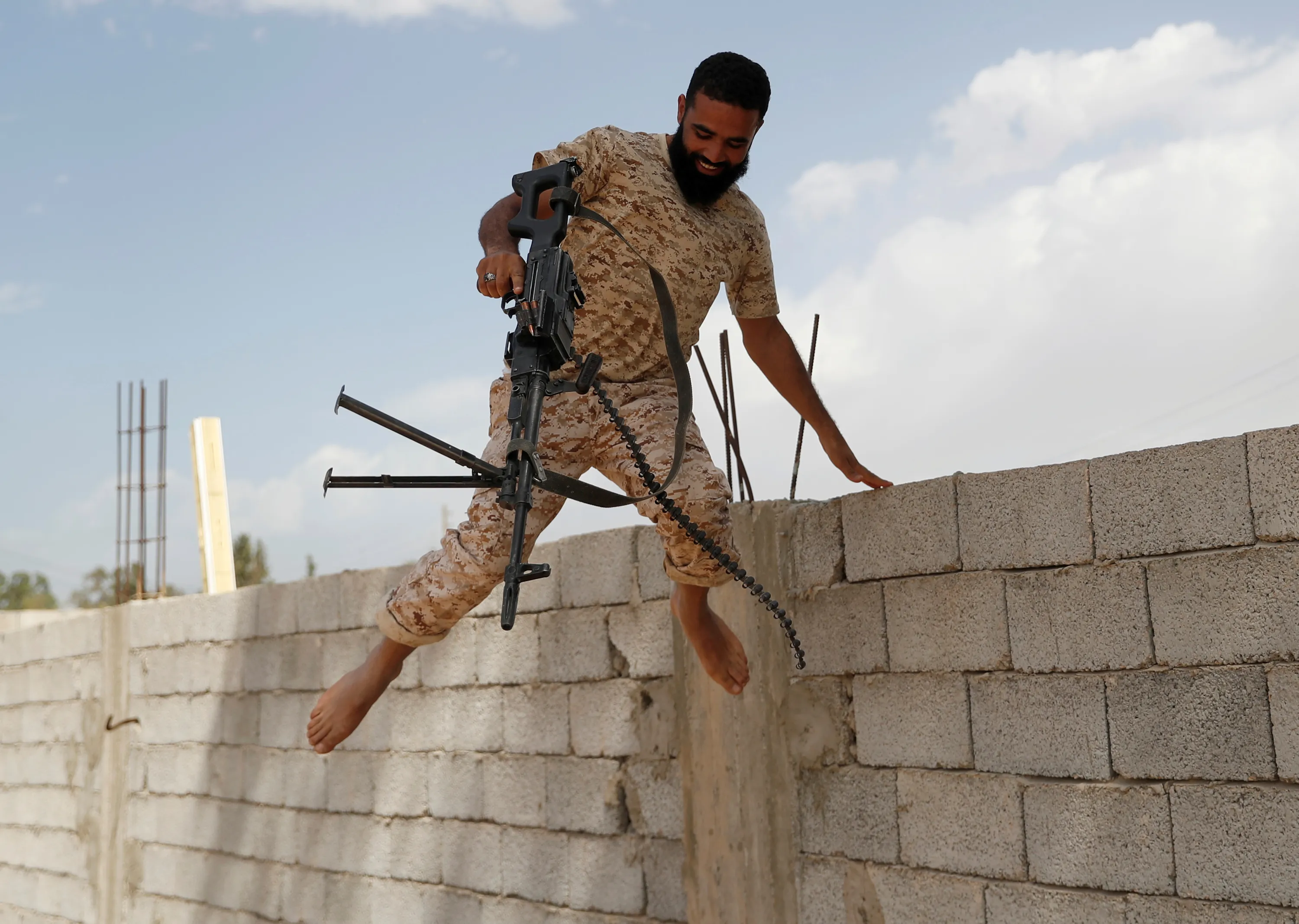 A member of the Libyan internationally recognised government forces jumps from a wall after he fired a rifle on the outskirts of Tripoli, Libya on May 12, 2019. (Photo by Goran Tomasevic/Reuters)
