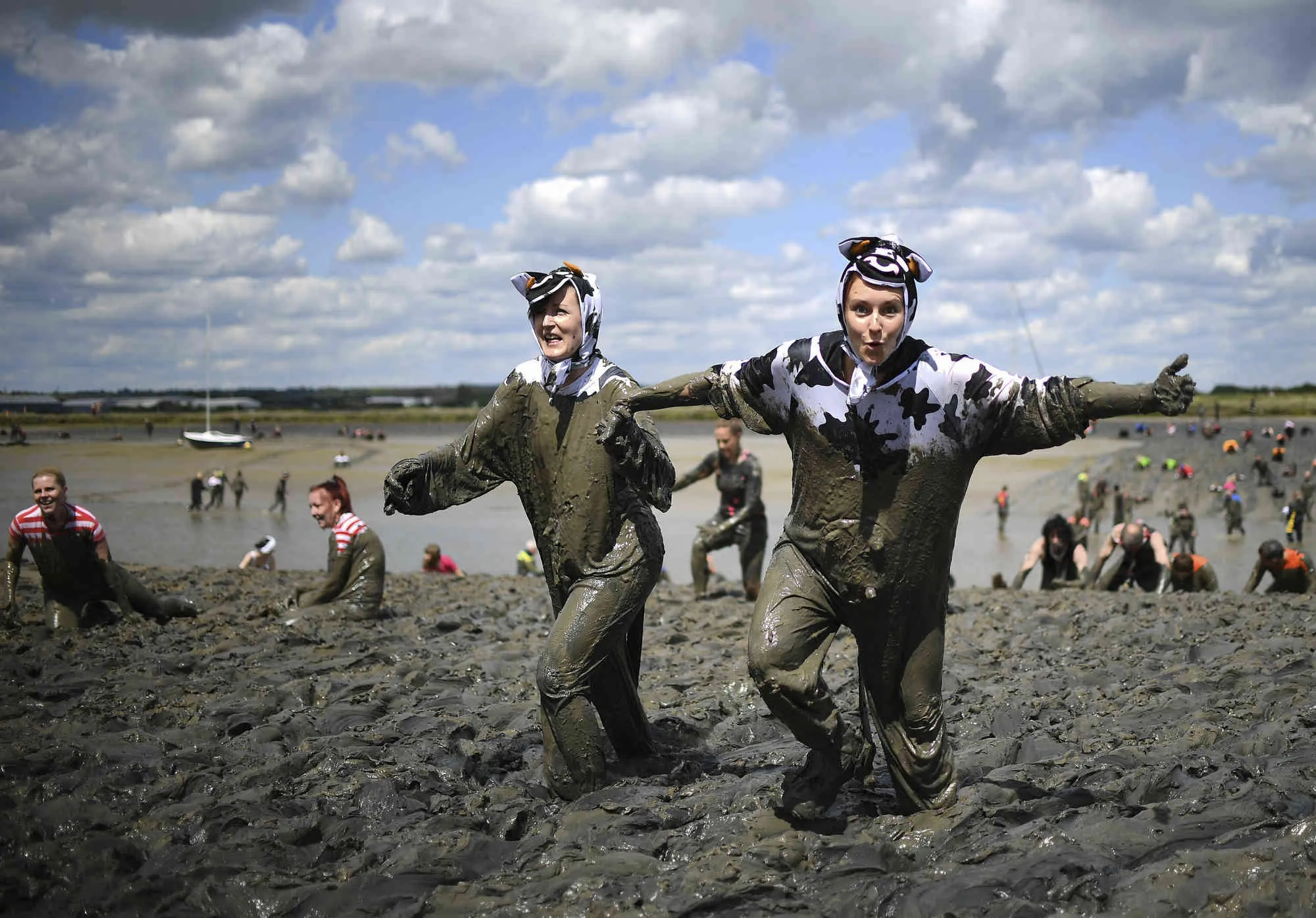 Competitors take part in the annual Maldon Mud Race, a charity event to race across the bed of the River Blackwater in Maldon, southern England on Sunday May 12, 2019. (Photo by Joe Giddens/PA Wire via AP Photo)