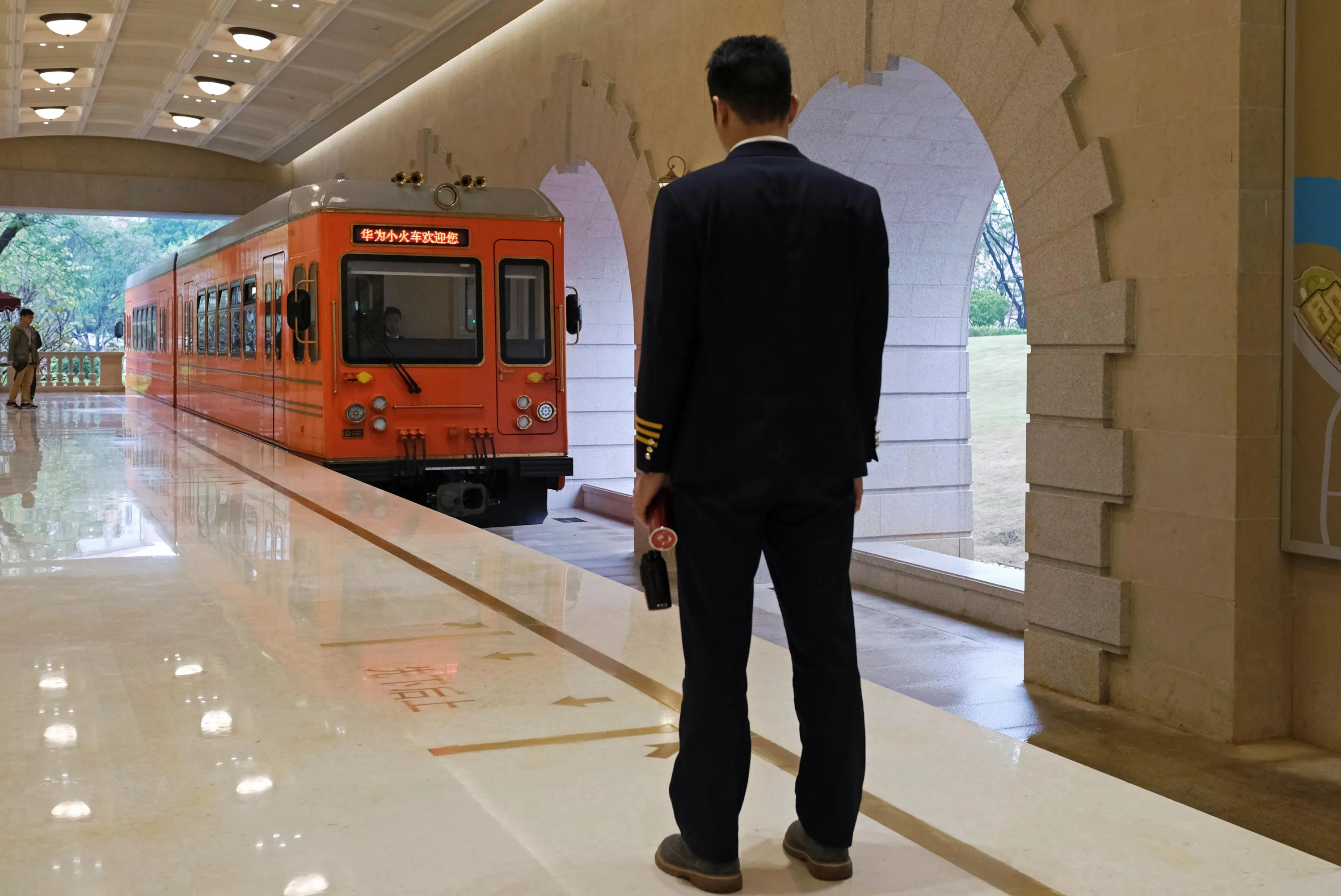 A conductor waits for an approaching train in Huawei's Ox Horn campus at Songshan Lake in Dongguan, Guangdong province, China March 25, 2019. (Photo by Tyrone Siu/Reuters)