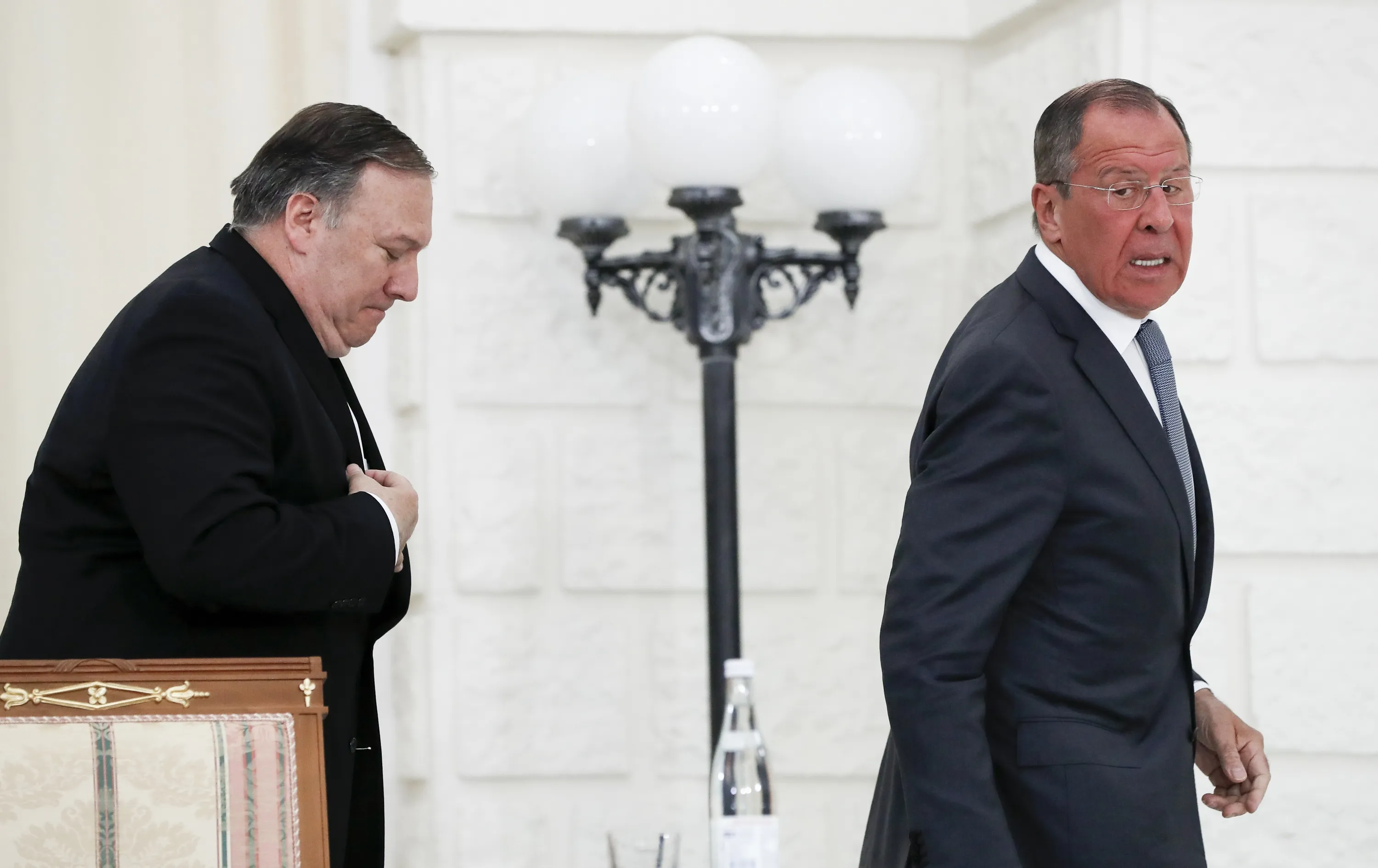 U.S. Secretary of State Mike Pompeo, left, and Russian Foreign Minister Sergey Lavrov leave their joint news conference following the talks in the Black Sea resort city of Sochi, southern Russia, Tuesday, May 14, 2019. Pompeo's first trip to Russia starts Tuesday in Sochi, where he and Russian Foreign Minister Sergey Lavrov are sitting down for talks and then having a joint meeting with President Vladimir Putin. (Photo by Pavel Golovkin/AP Photo/Pool)