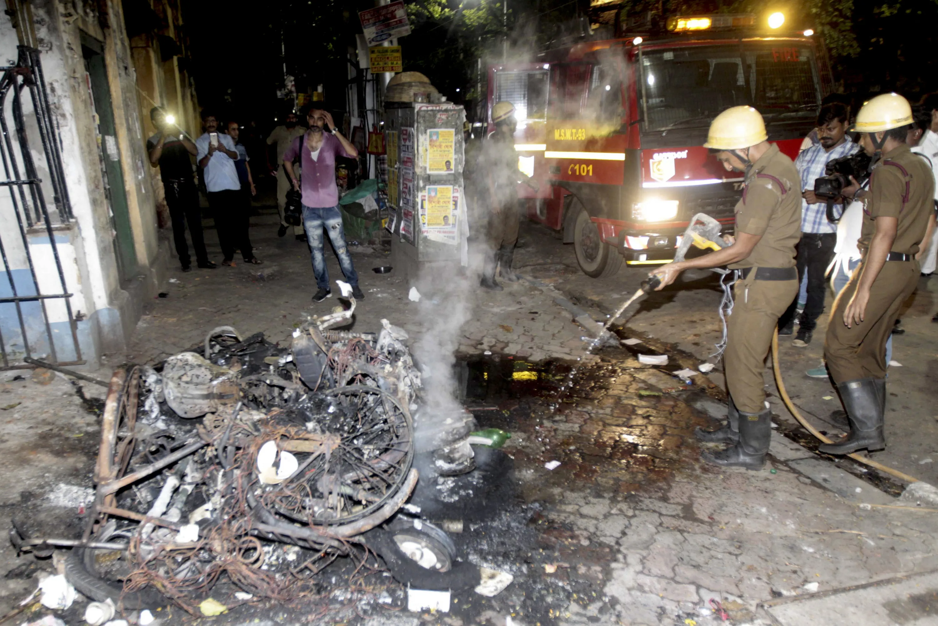 Firemen douse the fire after two wheelers were set on fire during clashes between Bharatiya Janata Party (BJP) workers and students outside the Calcutta University in Kolkata, India, Tuesday, May 14, 2019. Rival political supporters clashed with rocks and sticks during an election rally by the Hindu nationalist party BJP leaving several people injured and a university college vandalized. (Photo by AP Photo)