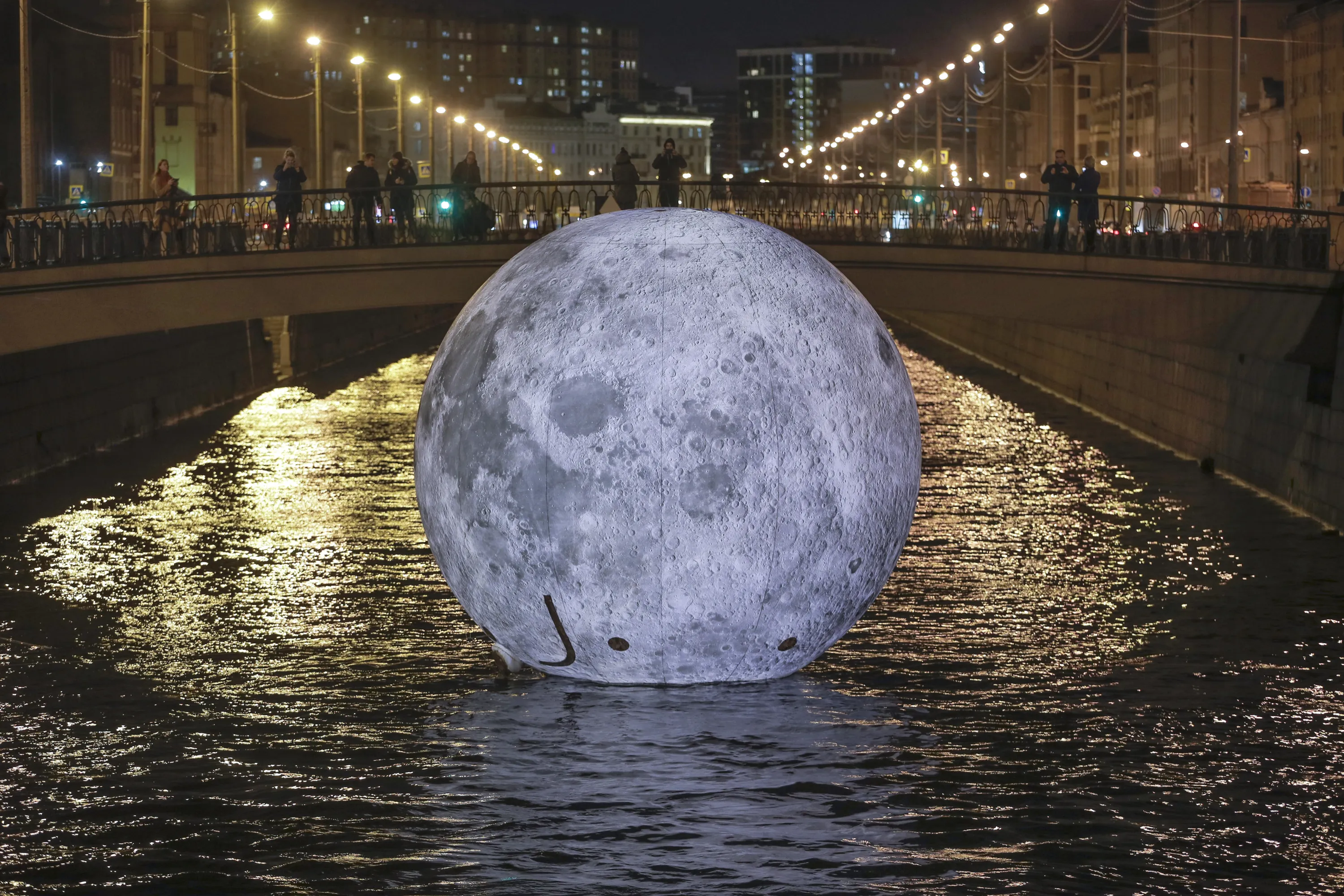 People look at a giant floating ball depicting the moon's surface, an installation for the “Festival of Lights”, in the water of Obvodny channel in St. Petersburg, Rusia, Saturday, November 3, 2018. (Photo by Dmitri Lovetsky/AP Photo)