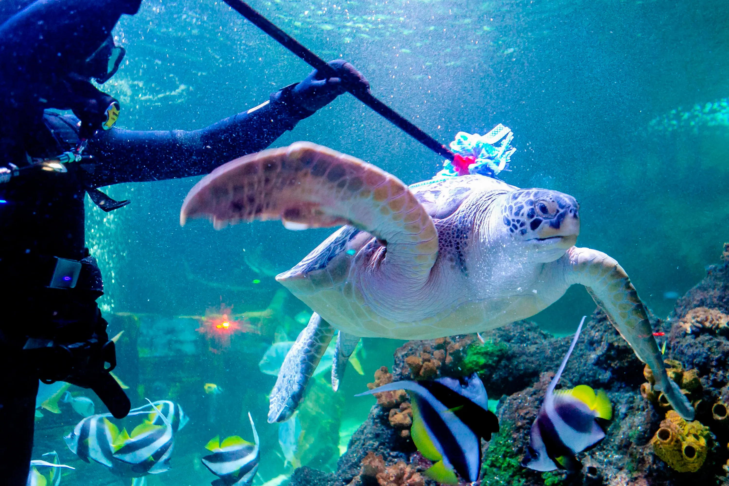 Diver Oliver Volz scrubs a sea turtle during a spring clean at the Sea Life aquarium, Timmendorfer Strand, Germany on May 14, 2019. (Photo by Frank Molter/AFP Photo)