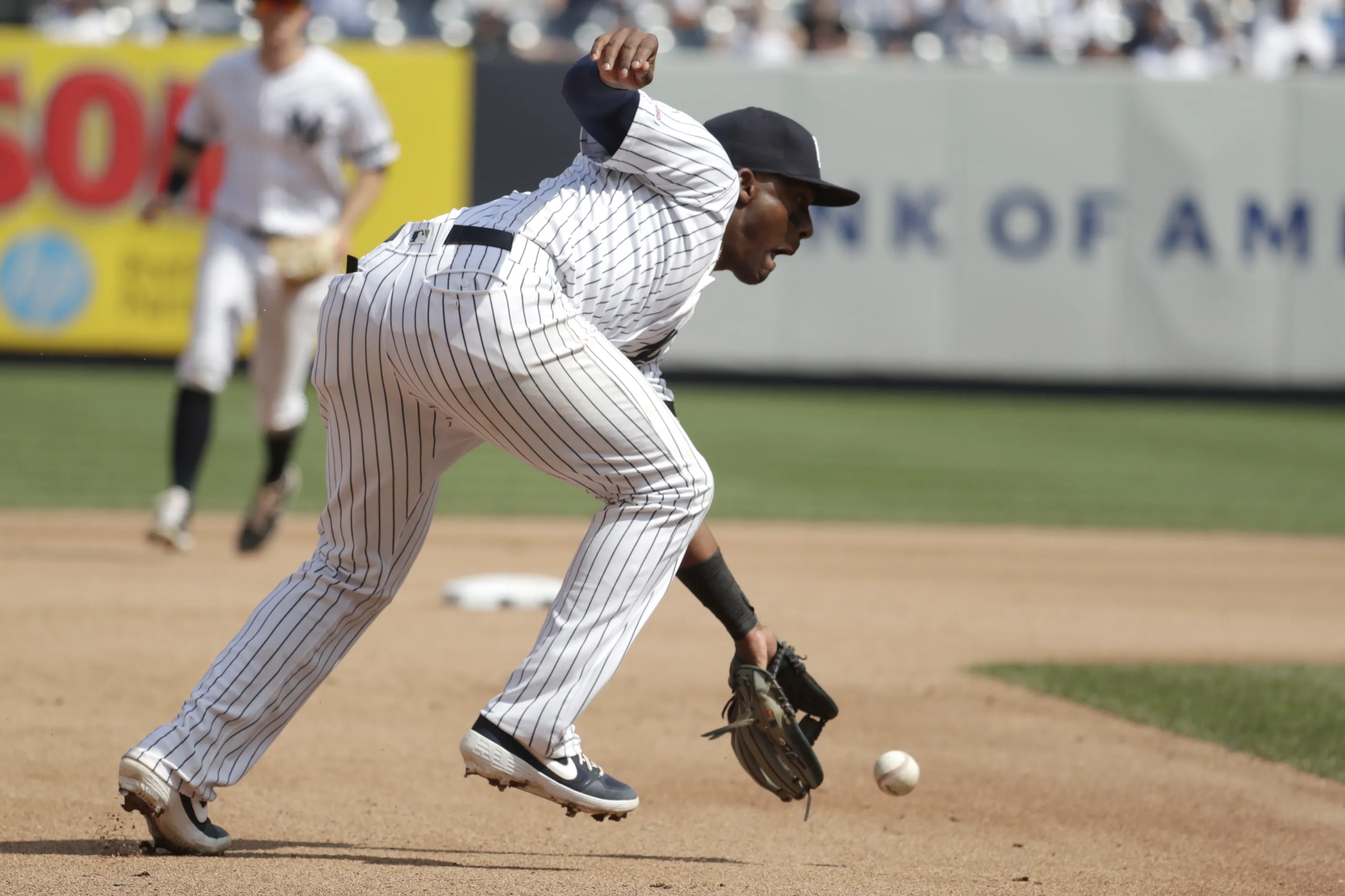 New York Yankees third baseman Miguel Andujar fields a ground ball hit by Minnesota Twins' Nelson Cruz during the seventh inning of a baseball game, Saturday, May 4, 2019, in New York. Andujar overthrew second base while trying to conduct a double play and Twins' Mitch Garver was able to move to third base on the error. (Photo by Julio Cortez/AP Photo)