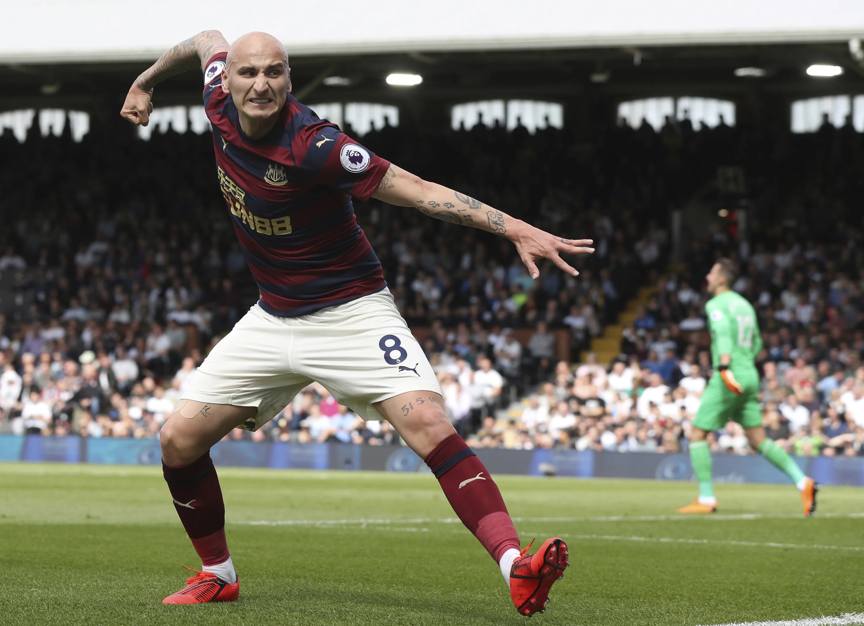 Newcastle United's Jonjo Shelvey celebrates scoring his side's opening goal during the English Premier League soccer match between Fulham and Newcastle United at the Craven Cottage stadium, London. Sunday May 12, 2019. (Photo by Jonathan Brady/PA Wire via AP Photo)