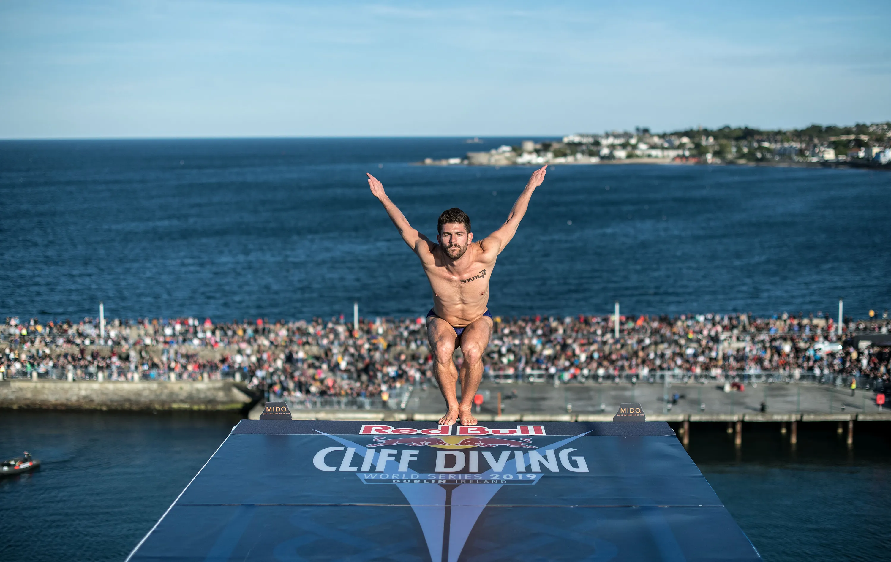 In this handout image provided by Red Bull, David Colturi of the USA dives from the 27 metre platform at Dun Laoghaire Harbour during the final competition day of the second stop of the Red Bull Cliff Diving World Series on May 12, 2019 at Dublin, Ireland. (Photo by Romina Amato/Red Bull via Getty Images)