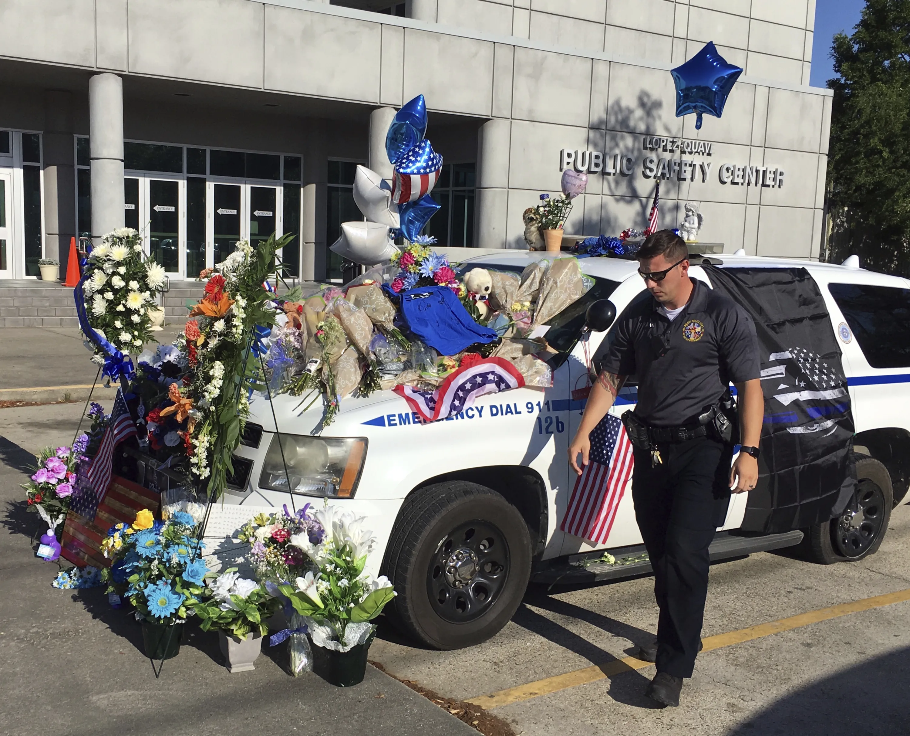 In this photo provided by WLOX, an unidentified Biloxi, Miss., police officer walks away after placing an angel statuette on Biloxi Police Officer Robert McKeithen's official vehicle, Monday, May, 6, 2019. McKeithen was shot in an ambush in front of the police station Sunday night. (Photo by John Fitzhugh/WLOX via AP Photo)