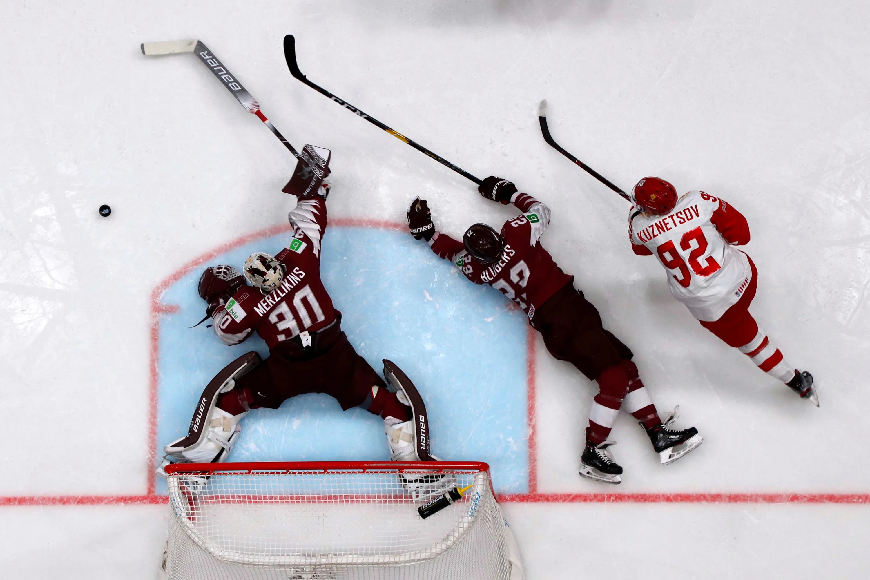 Latvia’s Elvis Merzlikins and Teodors Blugers and Russia's Yevgeny Kuznetsov in action during the Ice Hockey World Championships group B match between Latvia and Russia at the Ondrej Nepela Arena in Bratislava, Slovakia, Saturday, May 18, 2019. (Photo by Vasily Fedosenko/Reuters)