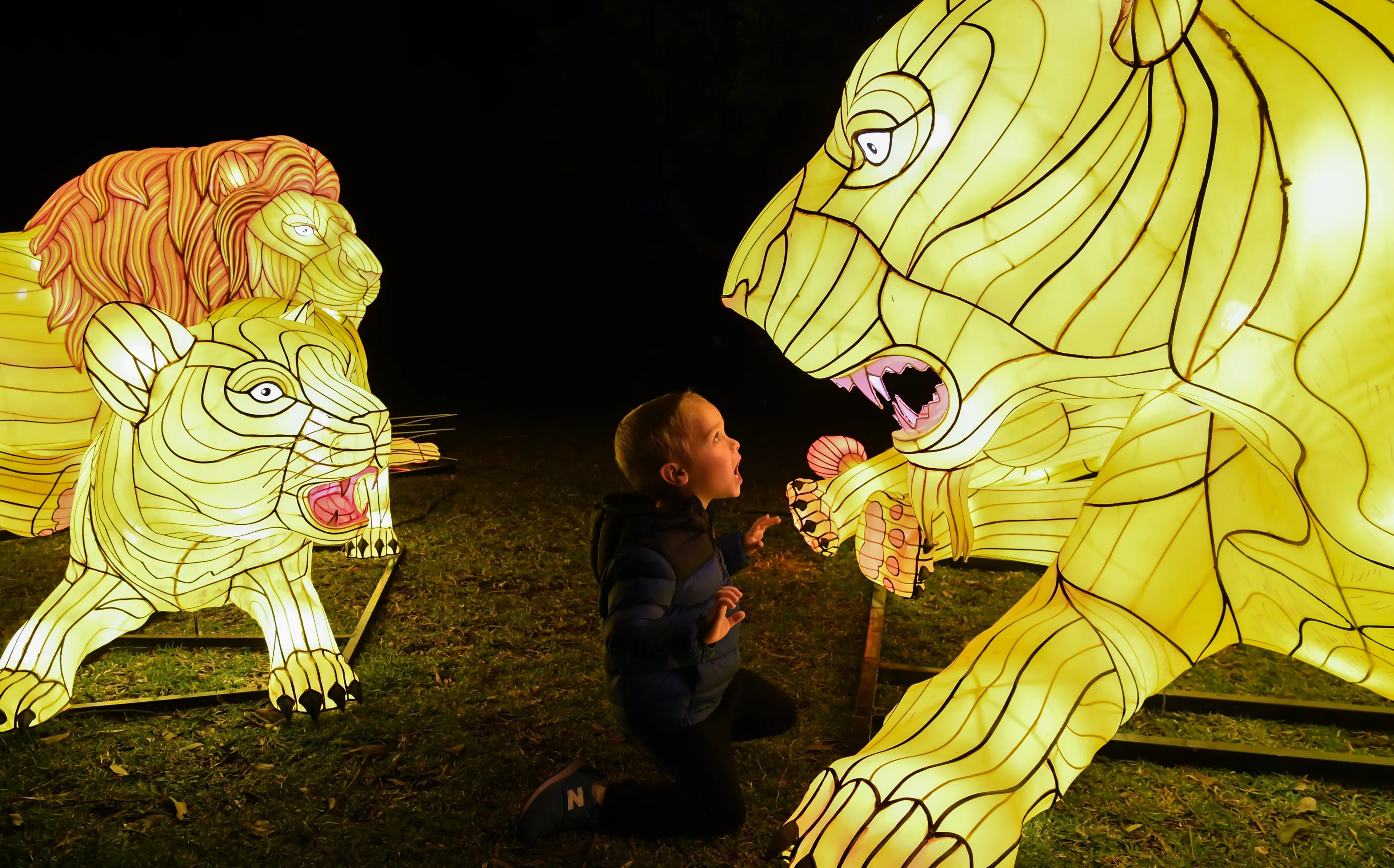 Illuminated lantern sculptures some tiger cubs as a young boy roars at one during the media preview of Vivid Sydney at Taronga Zoo on May 19, 2019 in Sydney, Australia. An illuminated trail of almost 300 lit lanterns of endangered species will glow every night at the zoo during Vivid Sydney which runs from May 24 throughout Sydney with hundreds of lit buildings and exhibits which attract hundreds of thousands of visitors each year. (Photo by James D. Morgan/Getty Images)