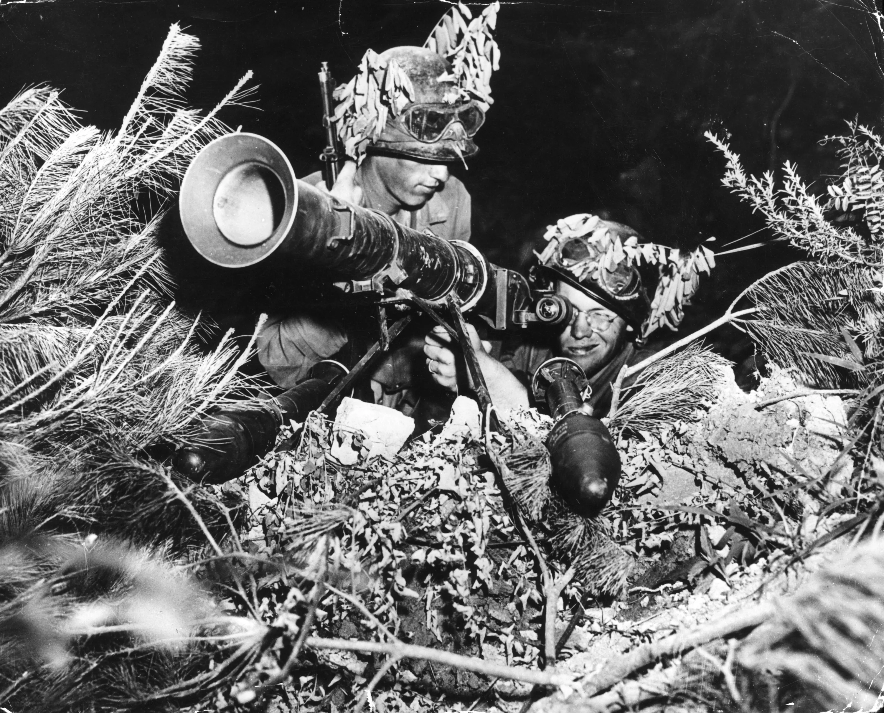 Two American soldiers operating a 3.5 inch rocket-launcher somewhere on the front line during the Korean War, August 1950. (Photo by Keystone)