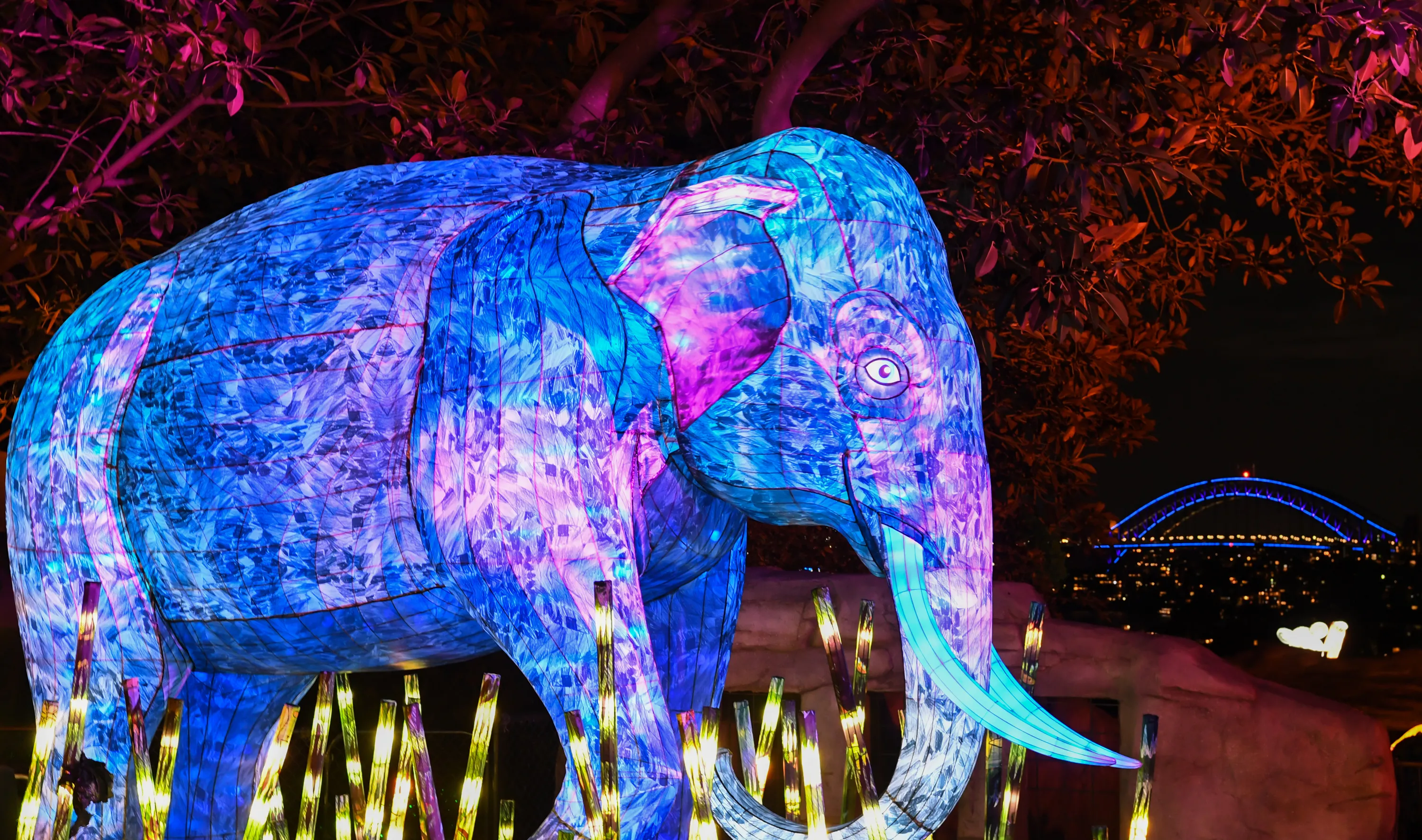 An Asian elephant lantern sculpture is illuminated with the Harbour Bridge lit blue in the background during the media preview of Vivid Sydney at Taronga Zoo on May 19, 2019 in Sydney, Australia. (Photo by James D. Morgan/Getty Images)