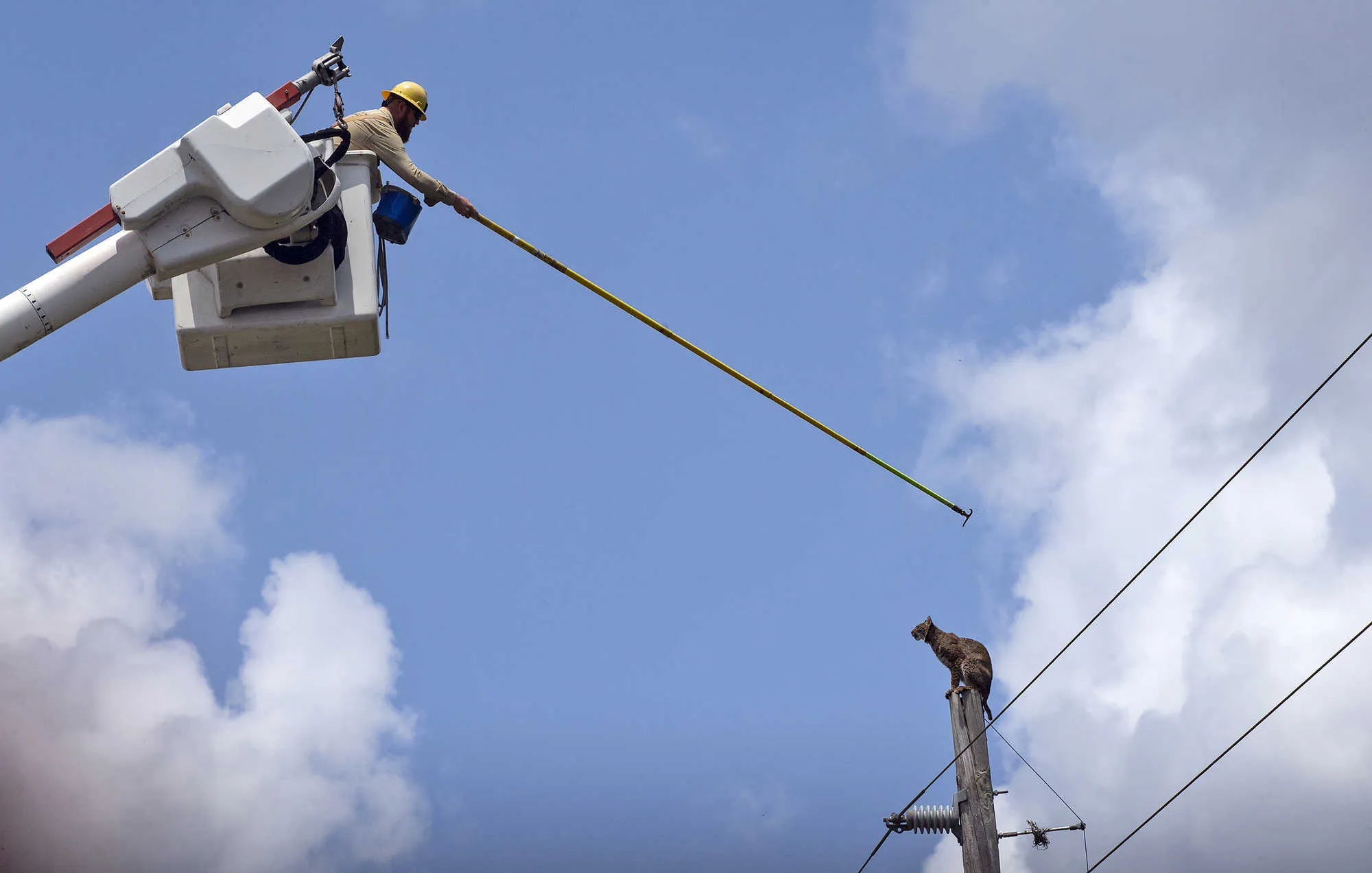 In this Thursday, May 9, 2019 photo, a utility worker attempts to nudge a bobcat to move it down an electrical power pole along Interstate 75 in Collier County near mile marker 78 next to the Florida Panther National Wildlife Refuge in Collier County, Fla. Crews from the Florida Fish and Wildlife commission and the state's Department of Transportation worked together Thursday afternoon to coax the bobcat down. (Photo by Jon Austria/Naples Daily News via AP Photo)