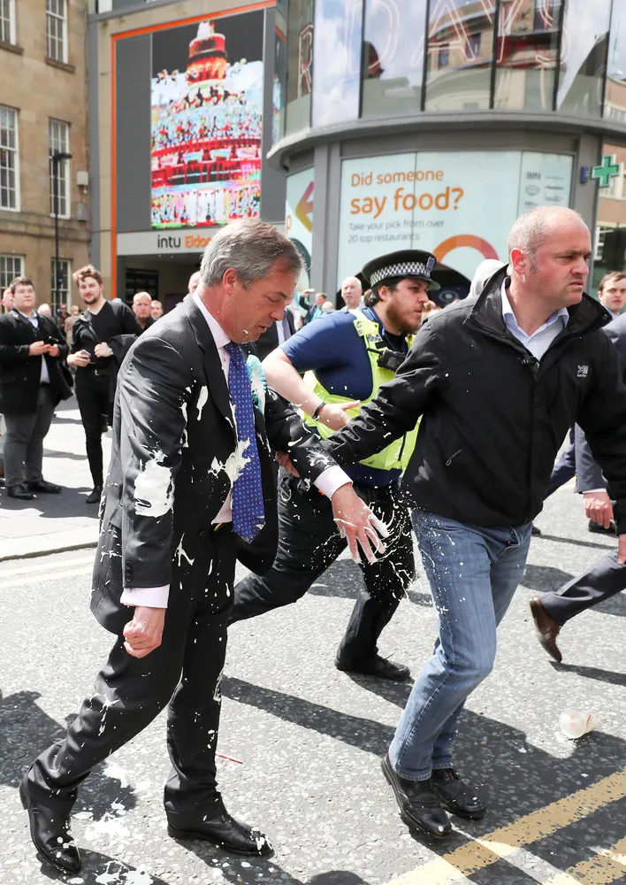 Brexit Party leader Nigel Farage gestures after being hit with a milkshake while arriving for a Brexit Party campaign event in Newcastle, Britain, May 20, 2019. (Photo by Scott Heppell/Reuters)