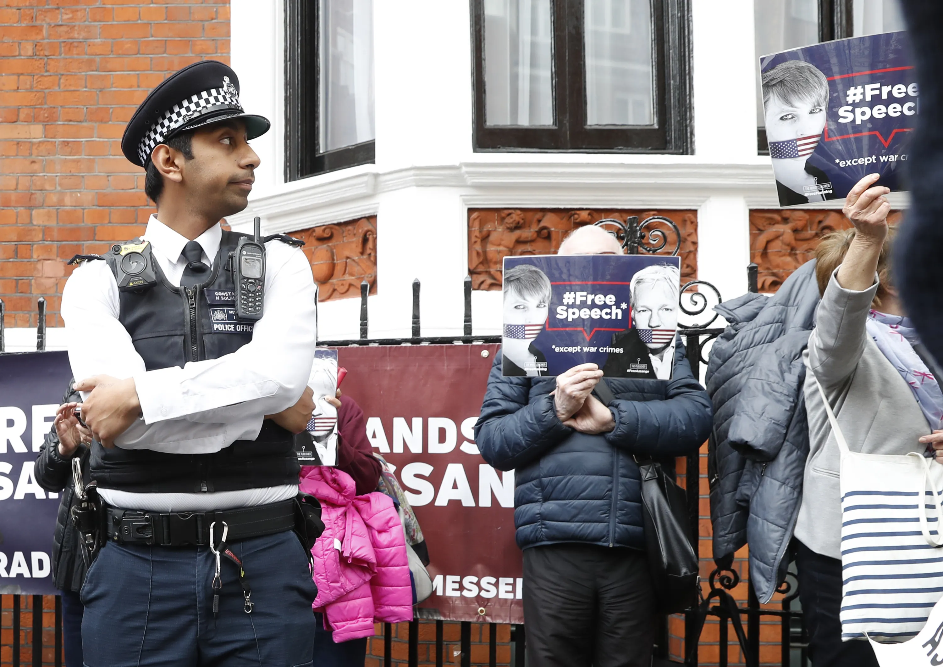 British police arrive and guard the Ecuadorian Embassy as protesters in support of Wikileaks founder Julian Assange demonstrate outside the embassy in London, Monday, May 20, 2019. Swedish authorities on Monday issued a request for a detention order against WikiLeaks founder Julian Assange, who is now jailed in Britain, a Swedish prosecutor said. (Photo by Alastair Grant/AP Photo)