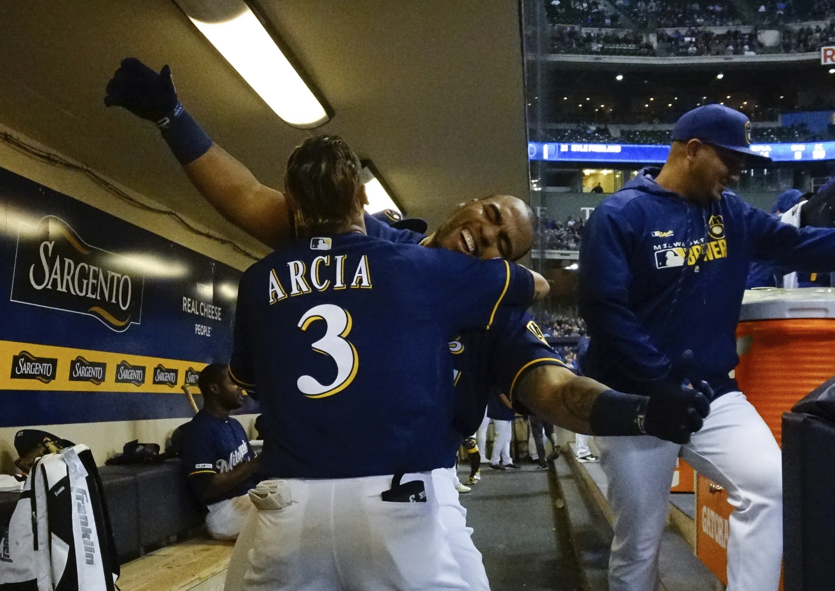 Milwaukee Brewers' Jesus Aguilar celebrates his three-run home run with Orlando Arcia (3) during the first inning of a baseball game against the Colorado Rockies Monday, April 29, 2019, in Milwaukee. (Photo by Morry Gash/AP Photo)