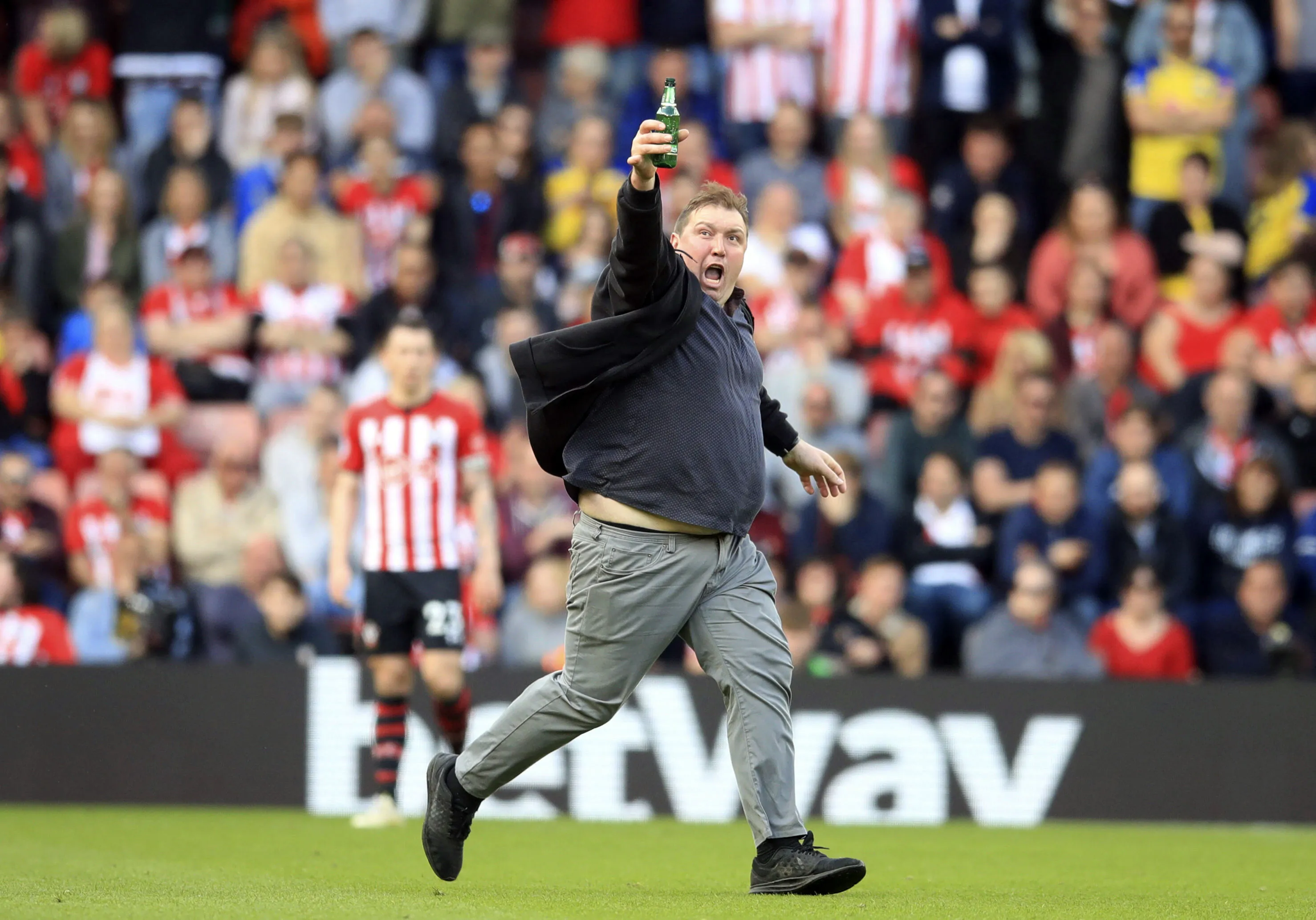 A fan runs on the pitch during the English Premier Leagues soccer match between Southampton and Huddersfield at St Mary's Stadium, Southampton, England, Sunday, May 12, 2019. (Photo by Adam Davy/PA Wire via AP Photo)