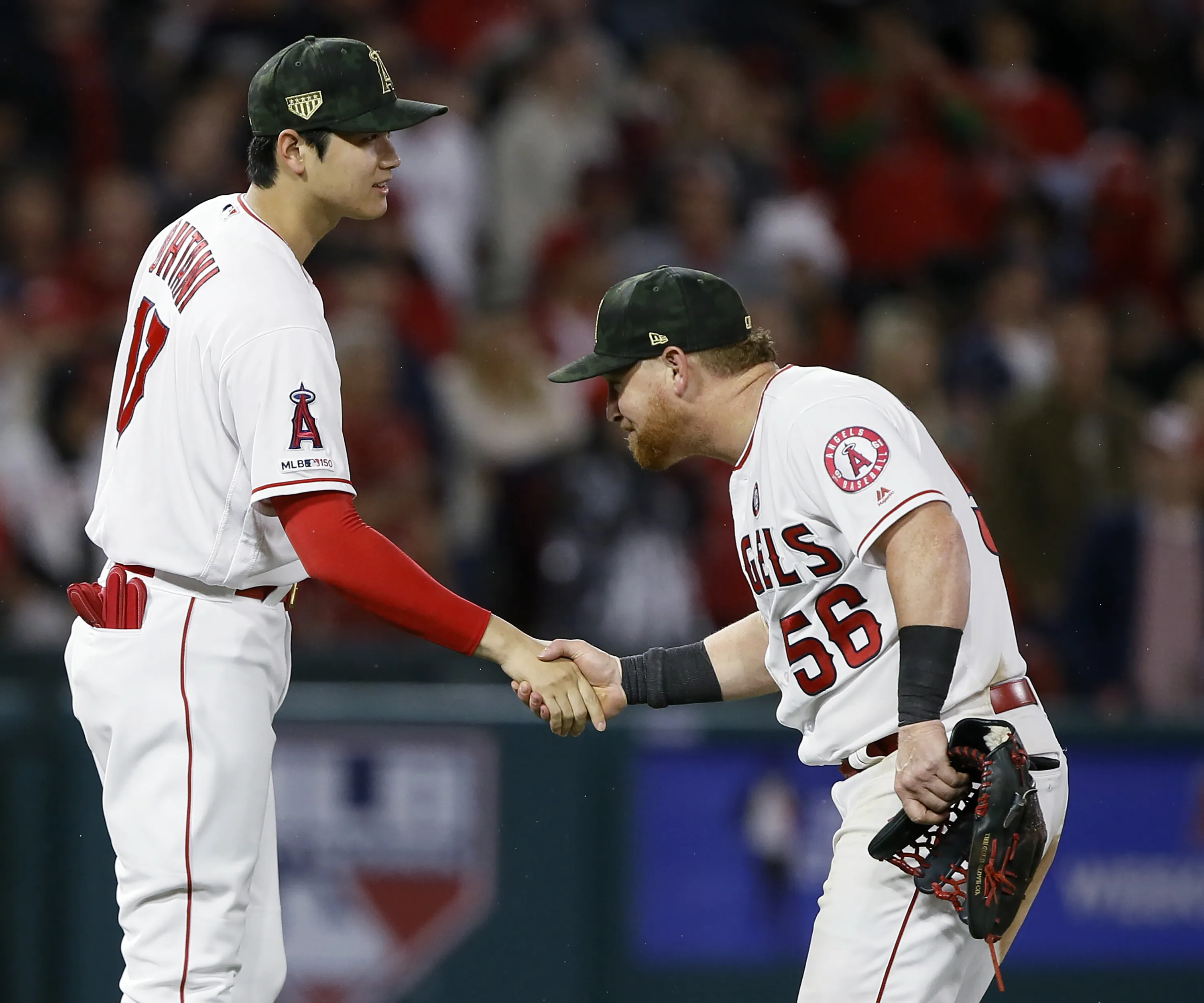 Los Angeles Angels designated hitter Shohei Ohtani, left, and right fielder Kole Calhoun celebrate after the Angels defeated the Kansas City Royals 6-3 in a baseball game in Anaheim, Calif., Saturday, May 18, 2019. (Photo by Alex Gallardo/AP Photo)