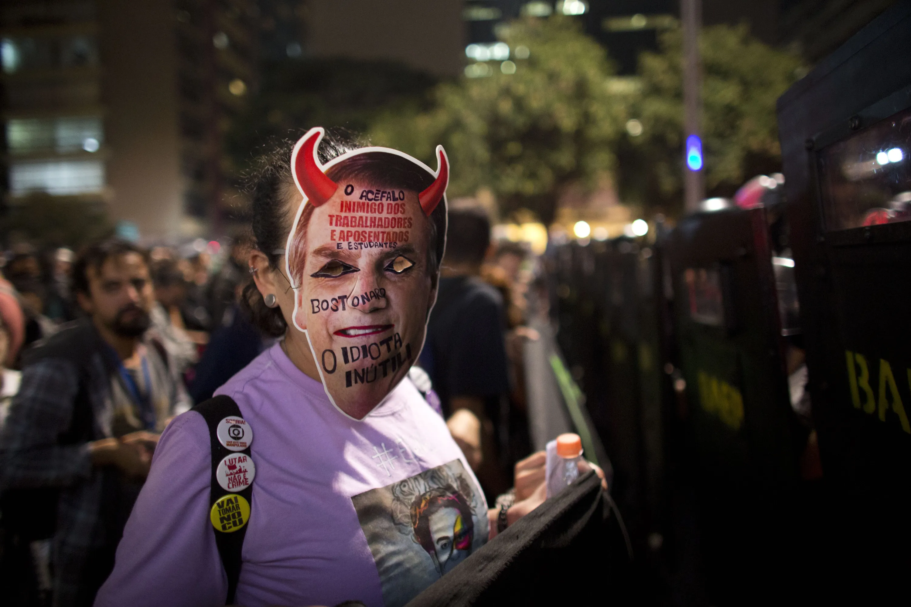 A woman wears a retouched mask with the image of Brazil's President Jair Bolsonaro during a protest against education cuts in Sao Paulo, Brazil, Thursday, May 23, 2019. A few hundred students demonstrated in Rio de Janeiro and Sao Paulo to protest big cuts in federal funding for the public education network by President Jair Bolsonaro. (Photo by Victor R. Caivano/AP Photo)