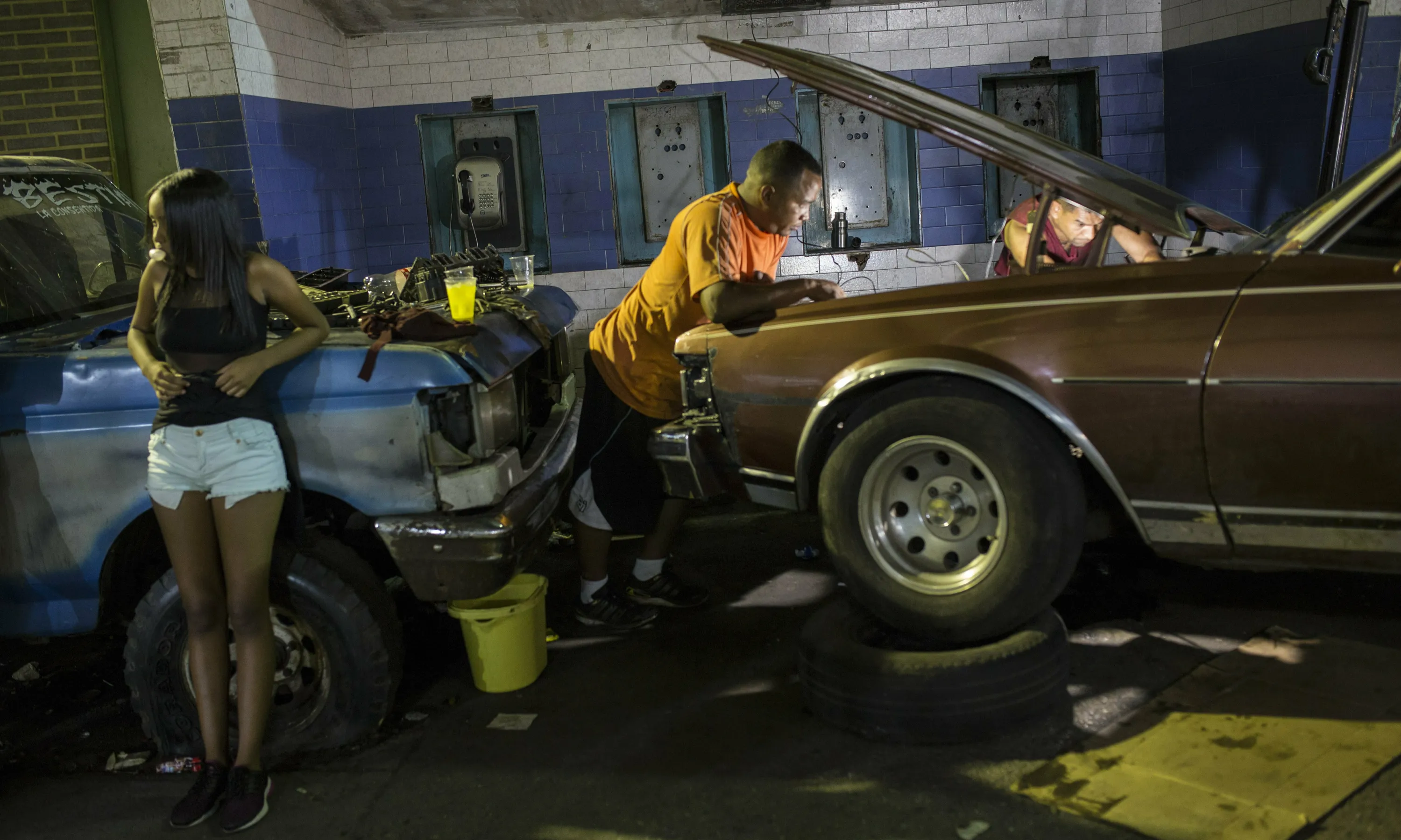 Men spend the evening repairing a car outside their home as a young woman pops chewing gum in Caracas, Venezuela, Friday, May 10, 2019. (Photo by Rodrigo Abd/AP Photo)