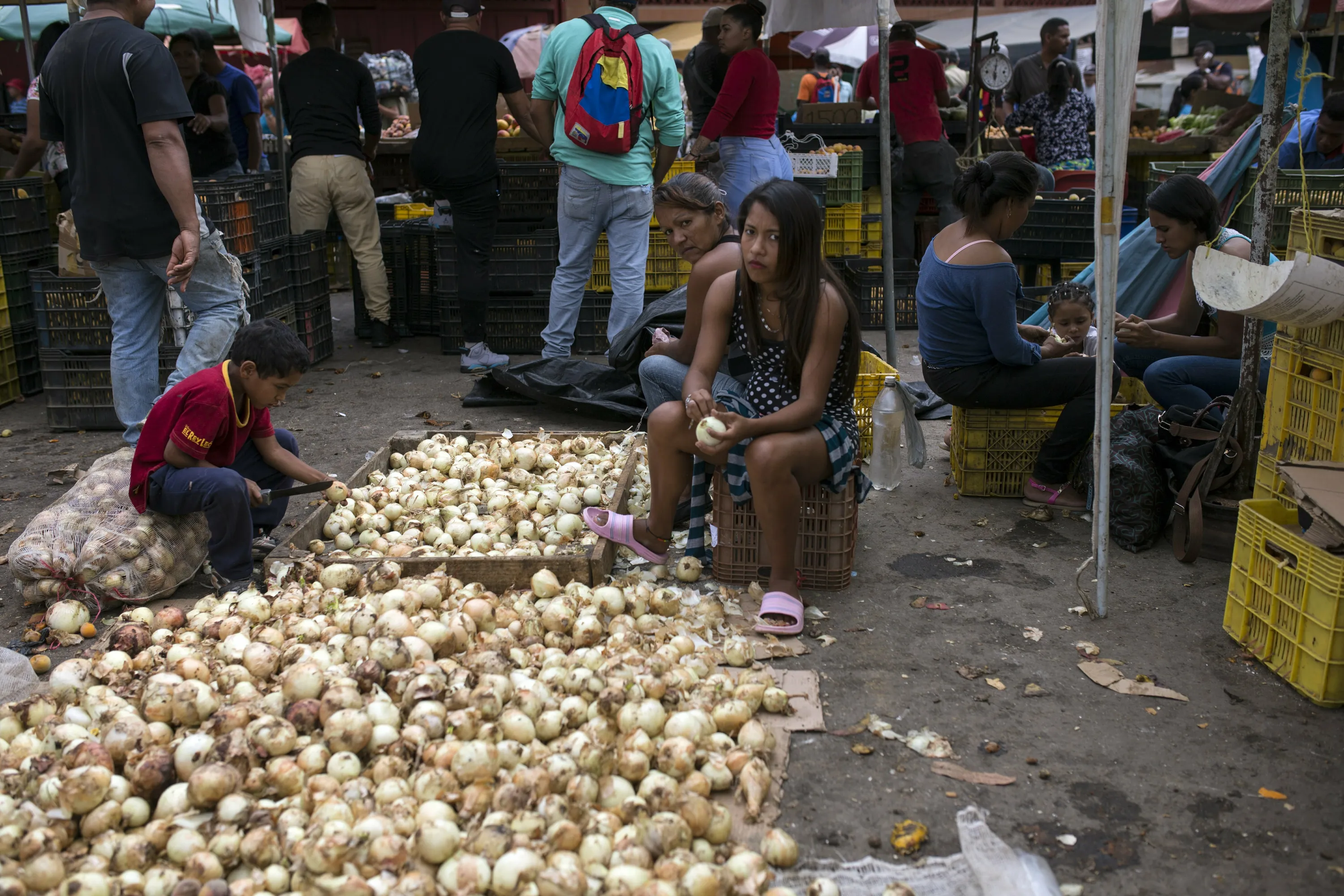 Vendors clean onions at the Coche Market in Caracas, Venezuela, Thursday, May 2, 2019. Farmers truck in the produce, meat and coffee from miles around the capital to the market known for its low prices. Its customers include everybody from restaurant owners to homemakers. (Photo by Rodrigo Abd/AP Photo)