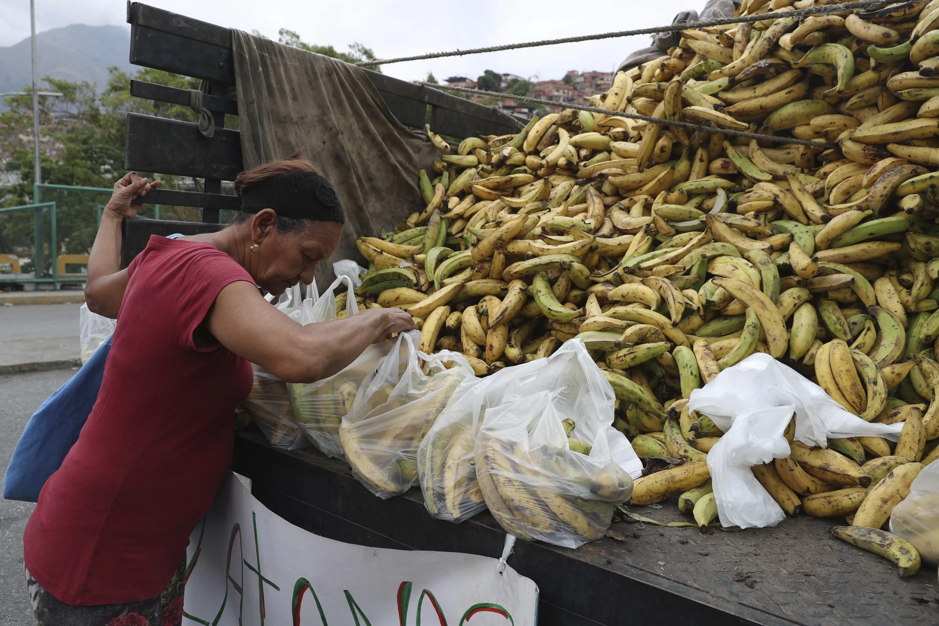 A woman inspects a bunch of bananas as she shops for the best option, in Caracas, Venezuela, Wednesday, May 8, 2019. Venezuela has been in sharp decline for years, suffering from hyperinflation and shortages of food and medicine. (Photo by Martin Mejia/AP Photo)