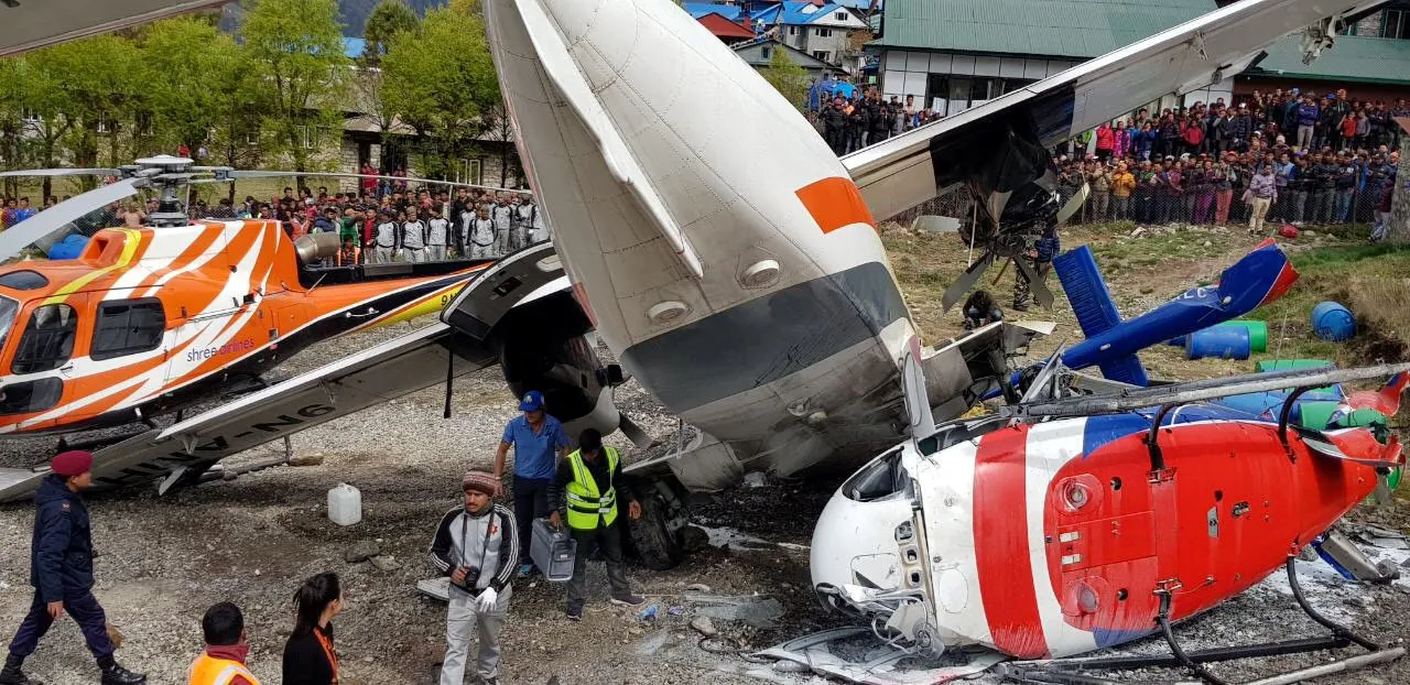A parked helicopter lies on its side, after an airplane crashed into it, while taking off in Lukla, Nepal on April 14, 2019. (Photo by Ang Tashi Sherpa/Handout via Reuters)