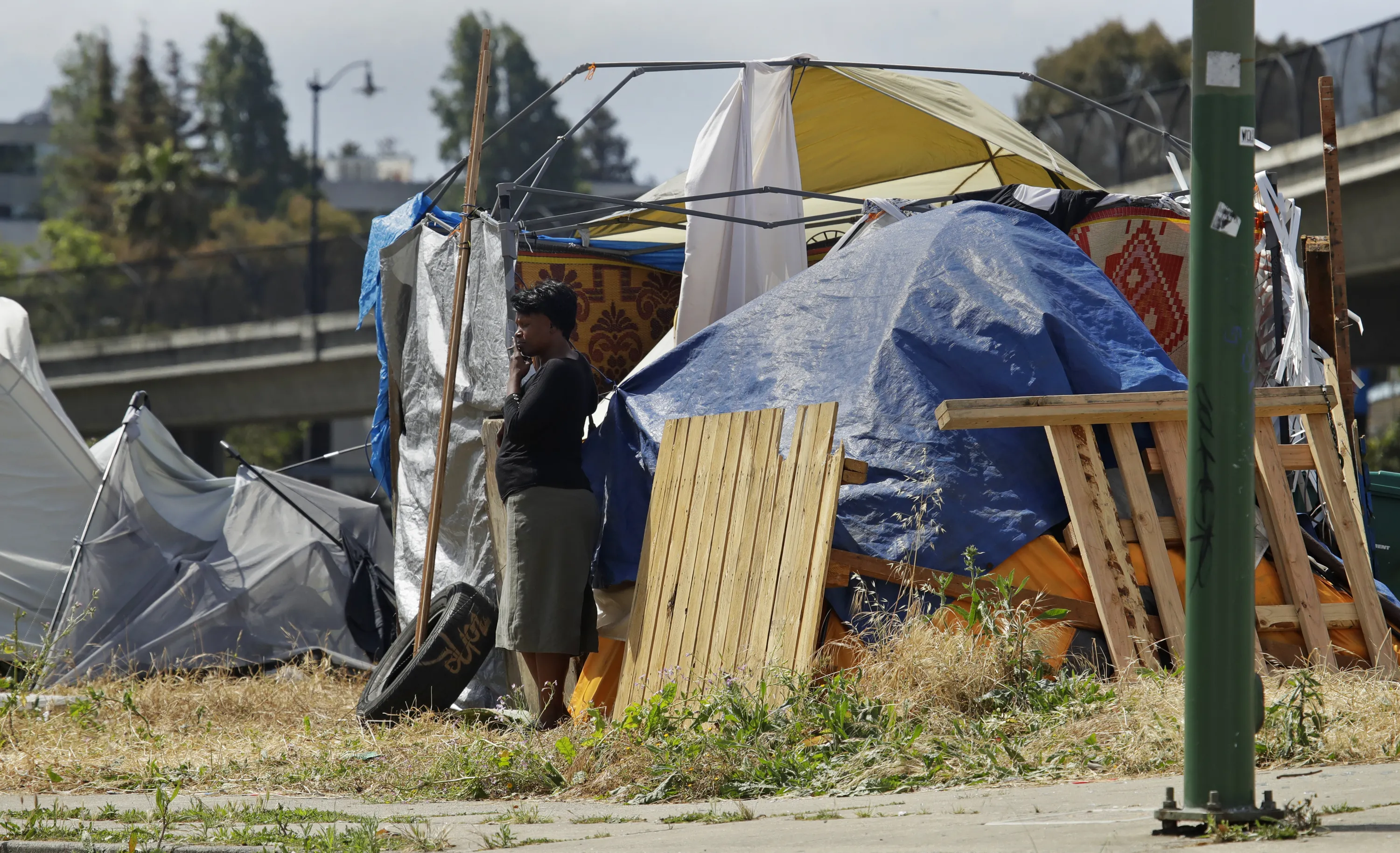 In this photo taken on Friday, May 17, 2019, a woman smokes a cigarette outside a homeless encampment in Oakland, Calif. California Gov. Gavin Newsom is creating a task force on homelessness as the state grapples with a housing crisis. Speaking Tuesday, May 21, in Oakland, Newsom described homelessness as an epidemic of statewide concern but says it will be best addressed at the local level. (Photo by Ben Margot/AP Photo/File)