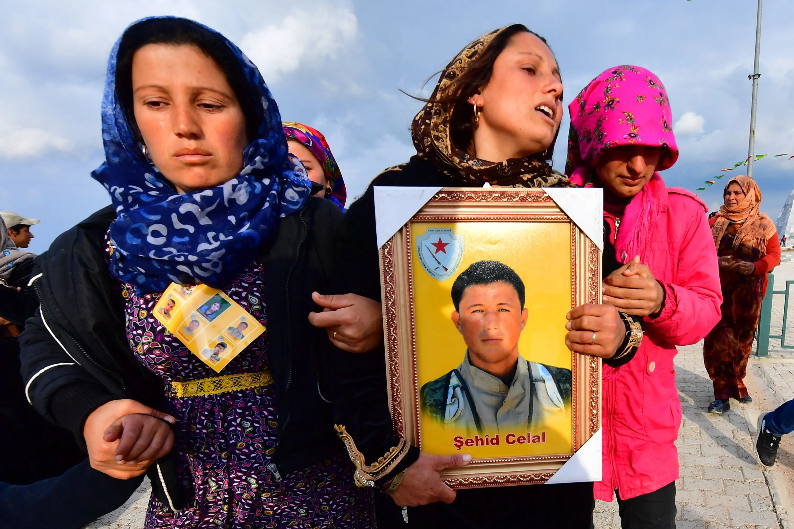 Relatives of a fighter of the Syrian Democratic Forces (SDF) who were killed in an attack claimed by the Islamic State (IS) group in Manbij walk with his portrait during a funeral for the attack victims in the northern Syrian-Kurdish town of Kobane on March 27, 2019. Manbij is a former IS stronghold that is now ruled by a military council affiliated with the Syrian Democratic Forces (SDF), the US-backed Kurdish-led alliance that declared victory over IS in its last redoubt in eastern Syria on Saturday. (Photo by Giuseppe Cacace/AFP Photo)
