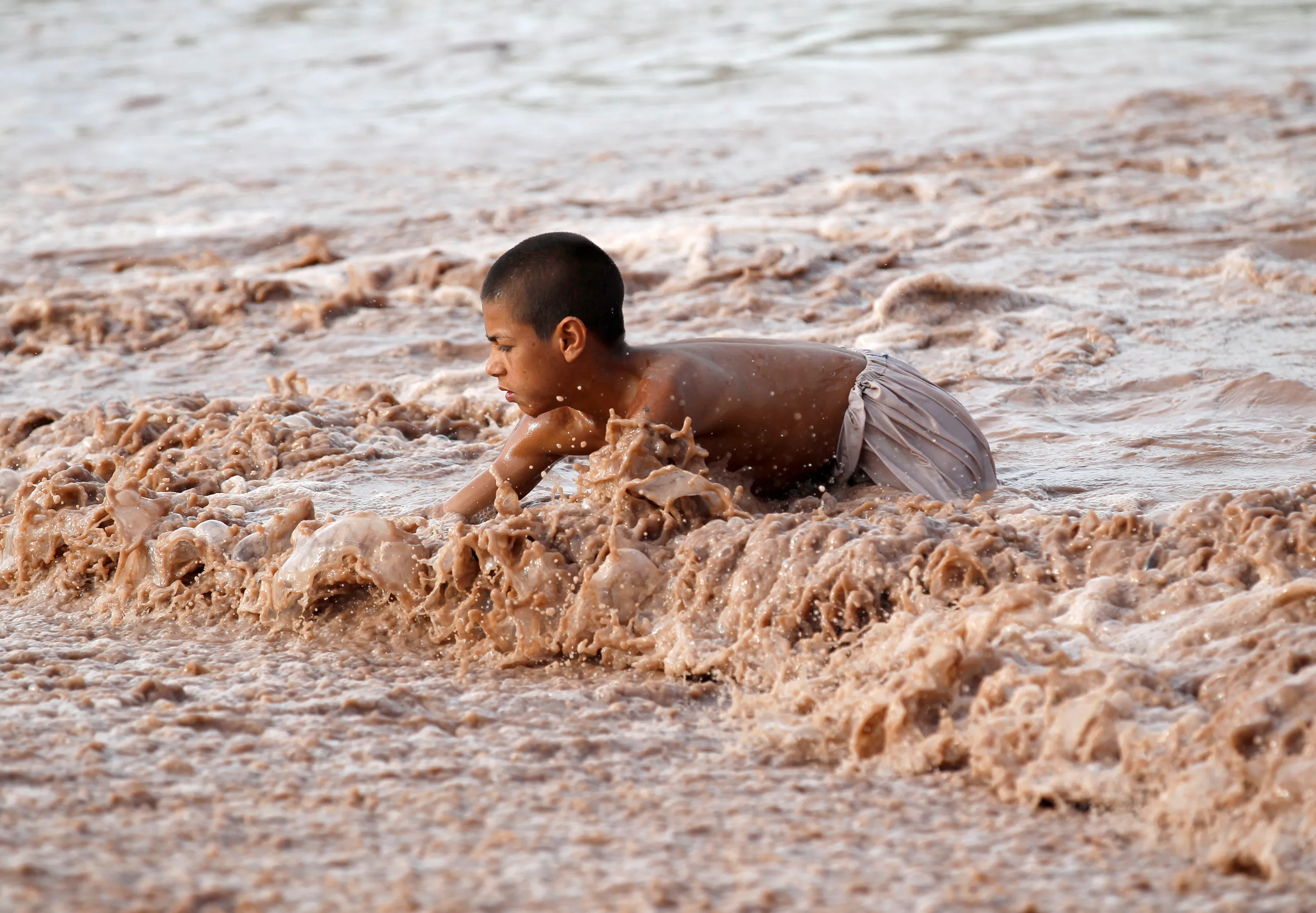 An Afghan boy swims in the muddy waters in Jalalabad province Afghanistan April 10, 2019. (Photo by Reuters/Parwiz)