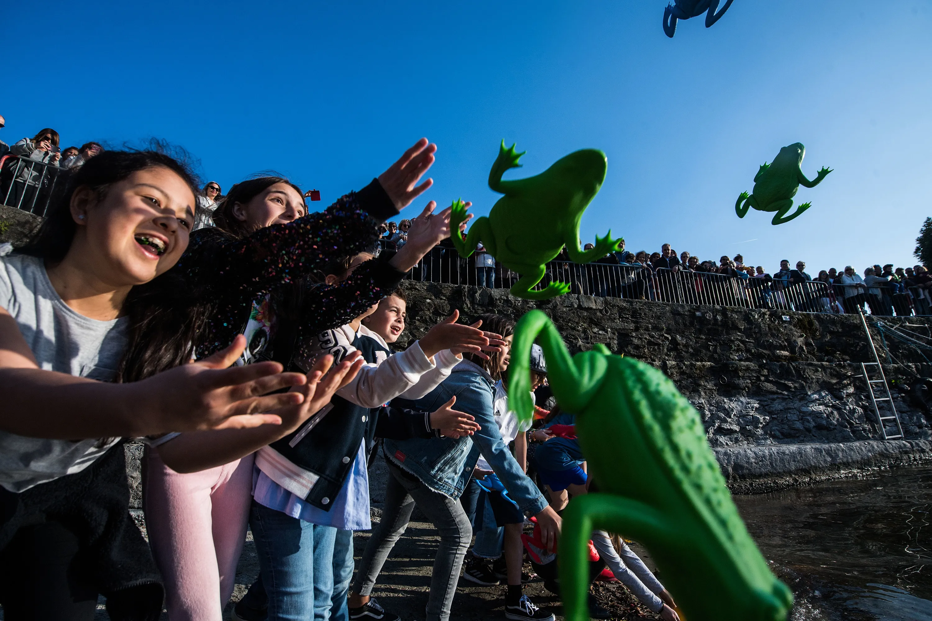 People throw plastic frogs into Lake Maggiore ahead ahead of the inauguration of the outdoor exhibition “Cracking Art” in Ascona, Switzerland, 30 March 2019. The exhibition runs from 31 March to 30 June. (Photo by Samuel Golay/EPA/EFE/Rex Features/Shutterstock)