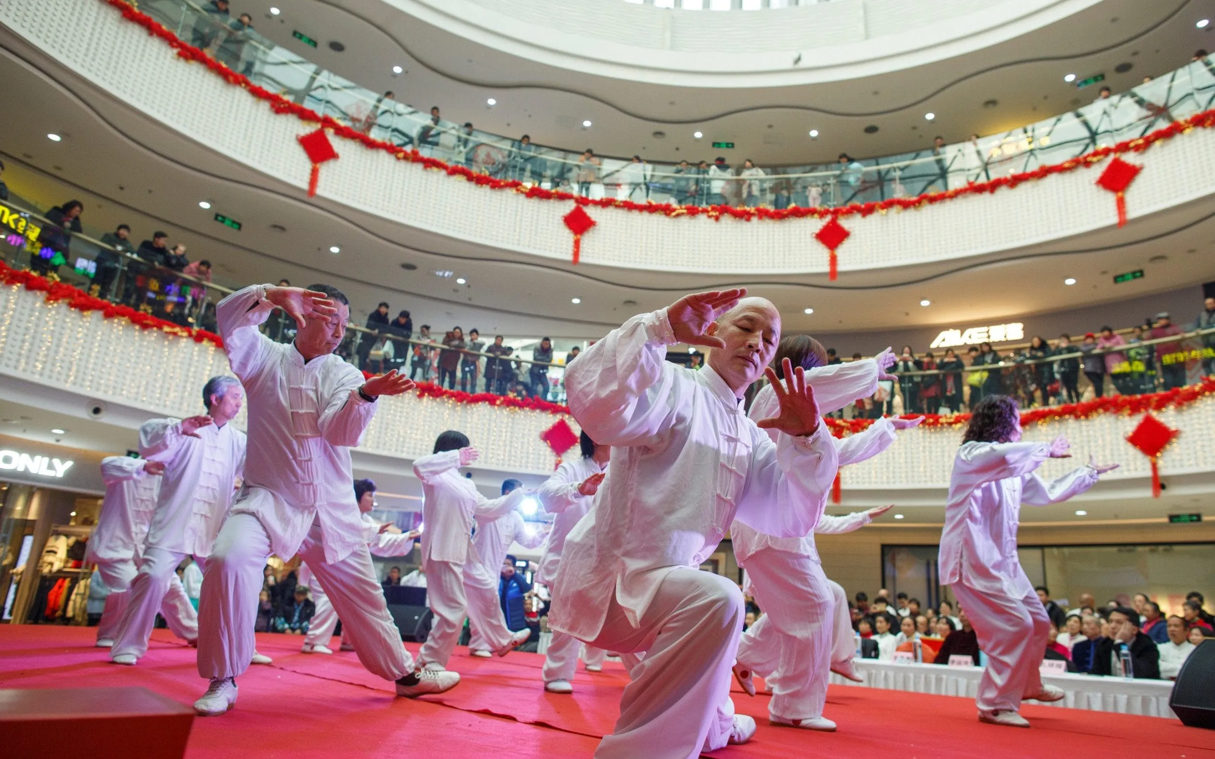 People perform a tai chi routine at a department store in Zhengzhou, Henan province, China, January 19, 2019. (Photo by Thomas Peter/Reuters)