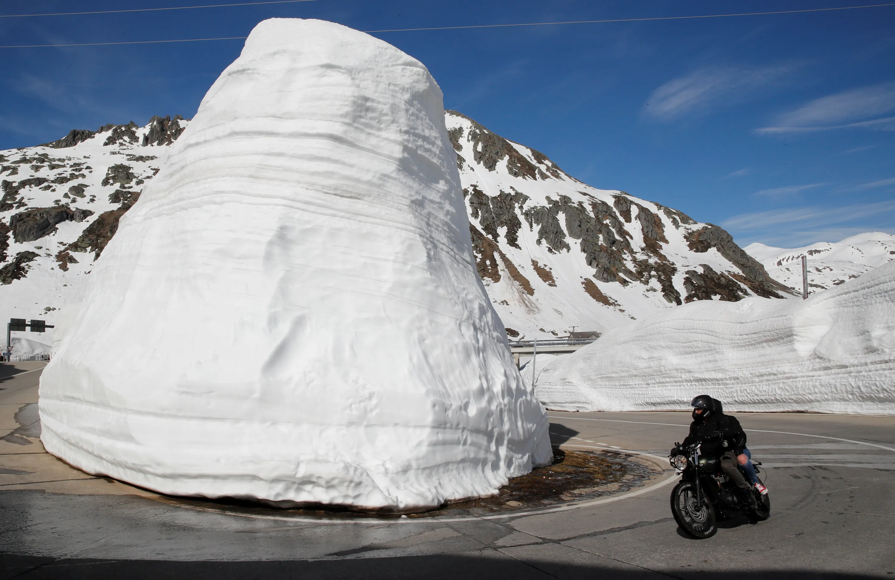 Walls of snow are seen beside as people ride on a bike during sunny weather on the St. Gotthard mountainpass road, Switzerland on June 1, 2019. (Photo by Arnd Wiegmann/Reuters)