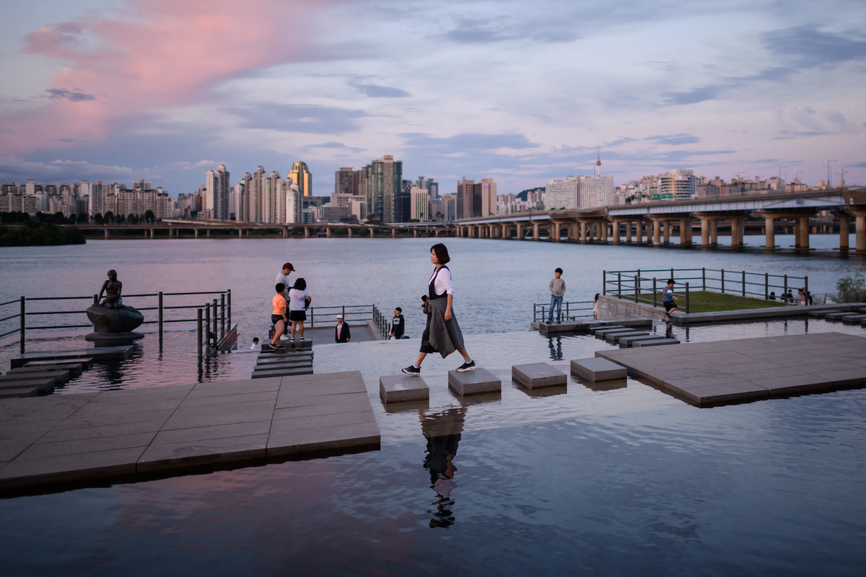 A woman walks over stepping-stones before the Han river and Seoul's skyline at Yeouido park on September 26, 2018. South Korea is observing the final day of the annual “Chuseok” thanksgiving holiday. (Photo by Ed Jones/AFP Photo)