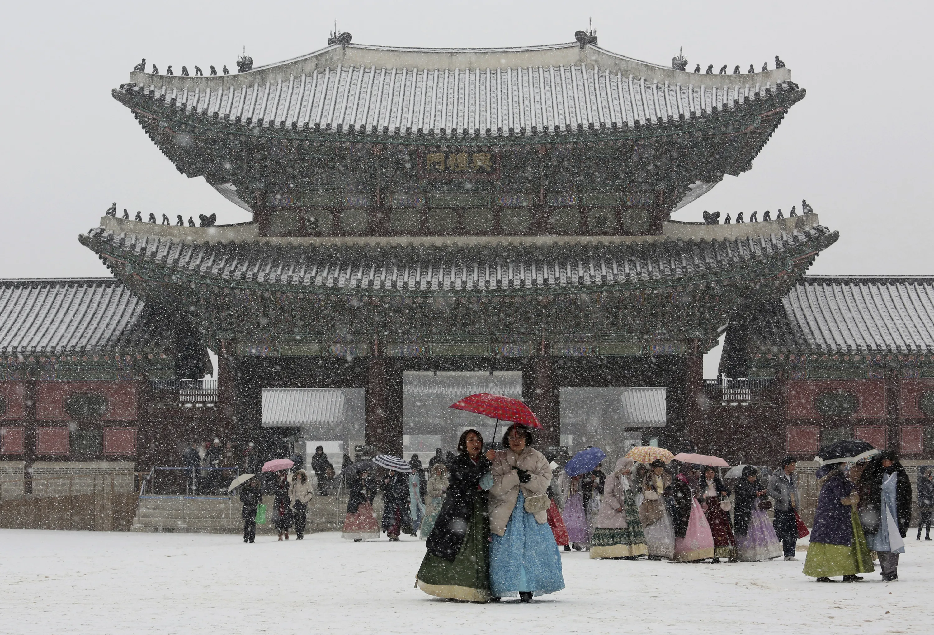 In this Thursday, December 13, 2018, file photo, visitors huddle under umbrellas in the snow at the Gyeongbok Palace, the main royal palace during the Joseon Dynasty, and one of South Korea's well known landmarks in Seoul, South Korea. (Photo by Ahn Young-joon/AP Photo)