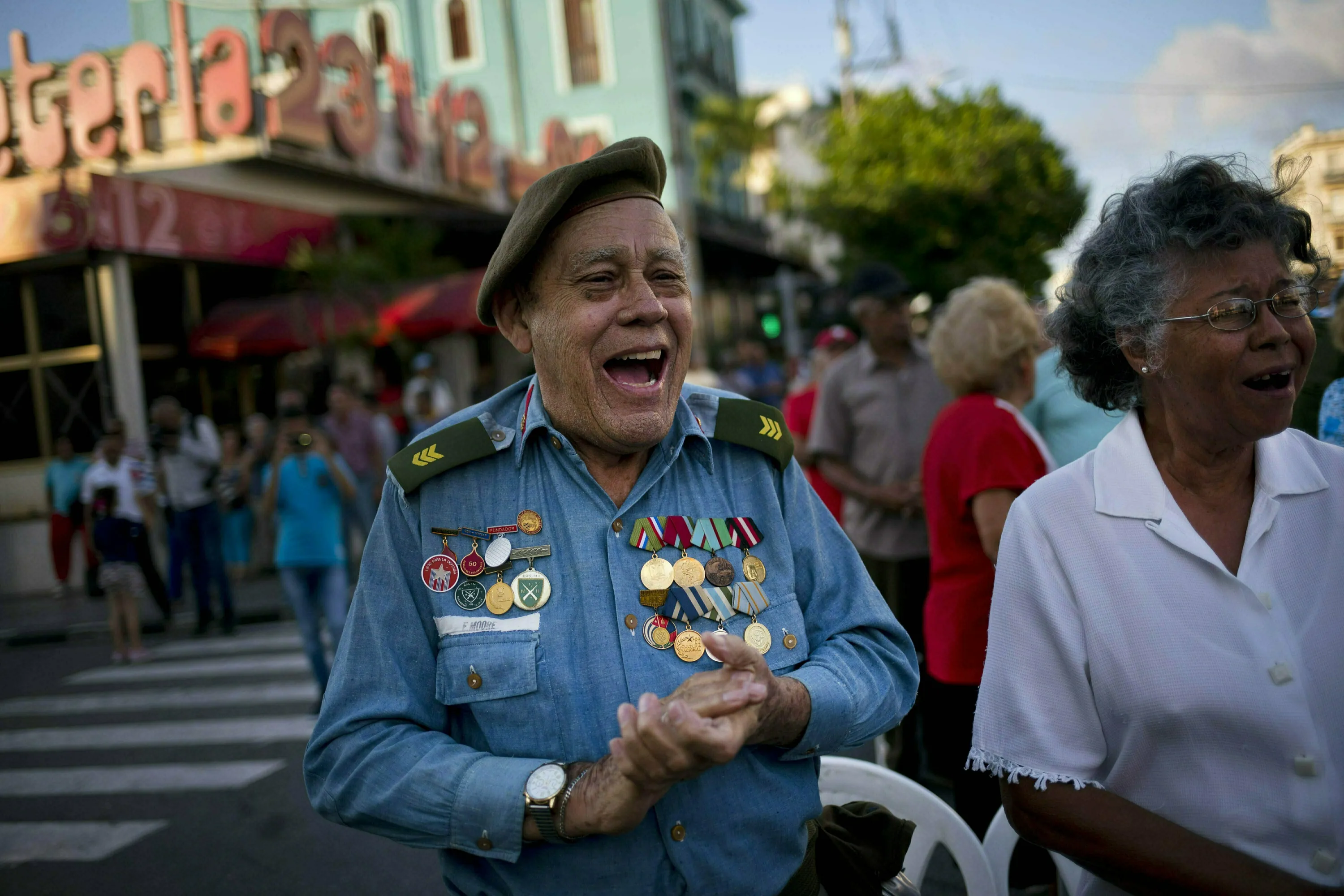 In this April 16, 2019 photo, Edwin Moore, a veteran of the U.S. Bay of Pigs invasion, sings during an event commemorating the 58th anniversary of Fidel Castro's declaration that his revolution in the 1950s was a socialist one, in Havana, Cuba. Reaction to news that the Trump administration plans to tighten sanctions against Cuba prompted worry, defiance and warnings on Tuesday, with Bay of Pigs veterans dismissing U.S. pressure. (Photo by Ramon Espinosa/AP Photo)
