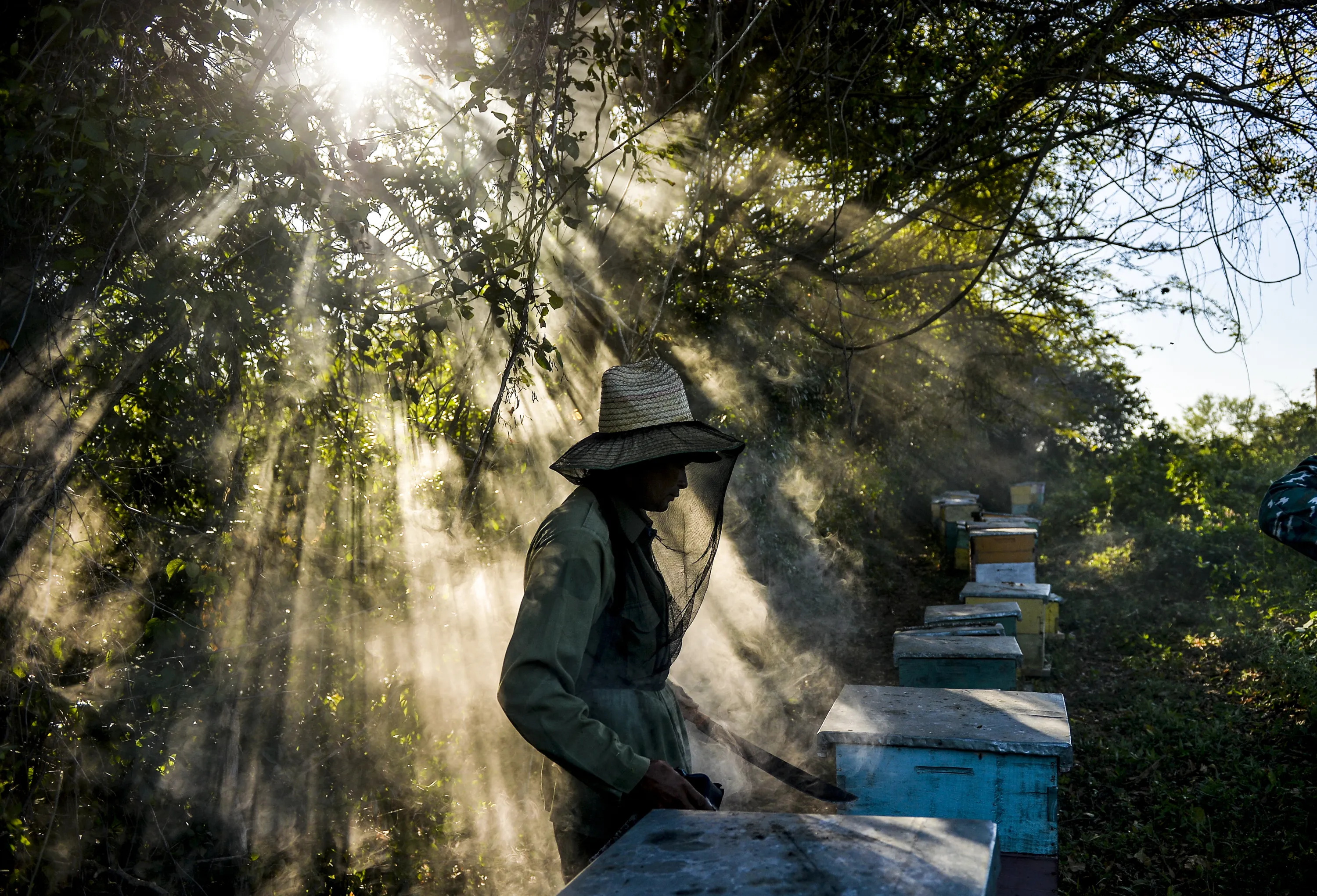 A beekeepers works at an apiary in Navajas, Matanzas province, Cuba on March 21, 2019. In the mountains of Matanzas province, in western Cuba, bees buzz free of agrotoxic, enjoying a diet rich in wild flowers and producing a high quality honey, that European markets crave for. (Photo by Yamil Lage/AFP Photo)