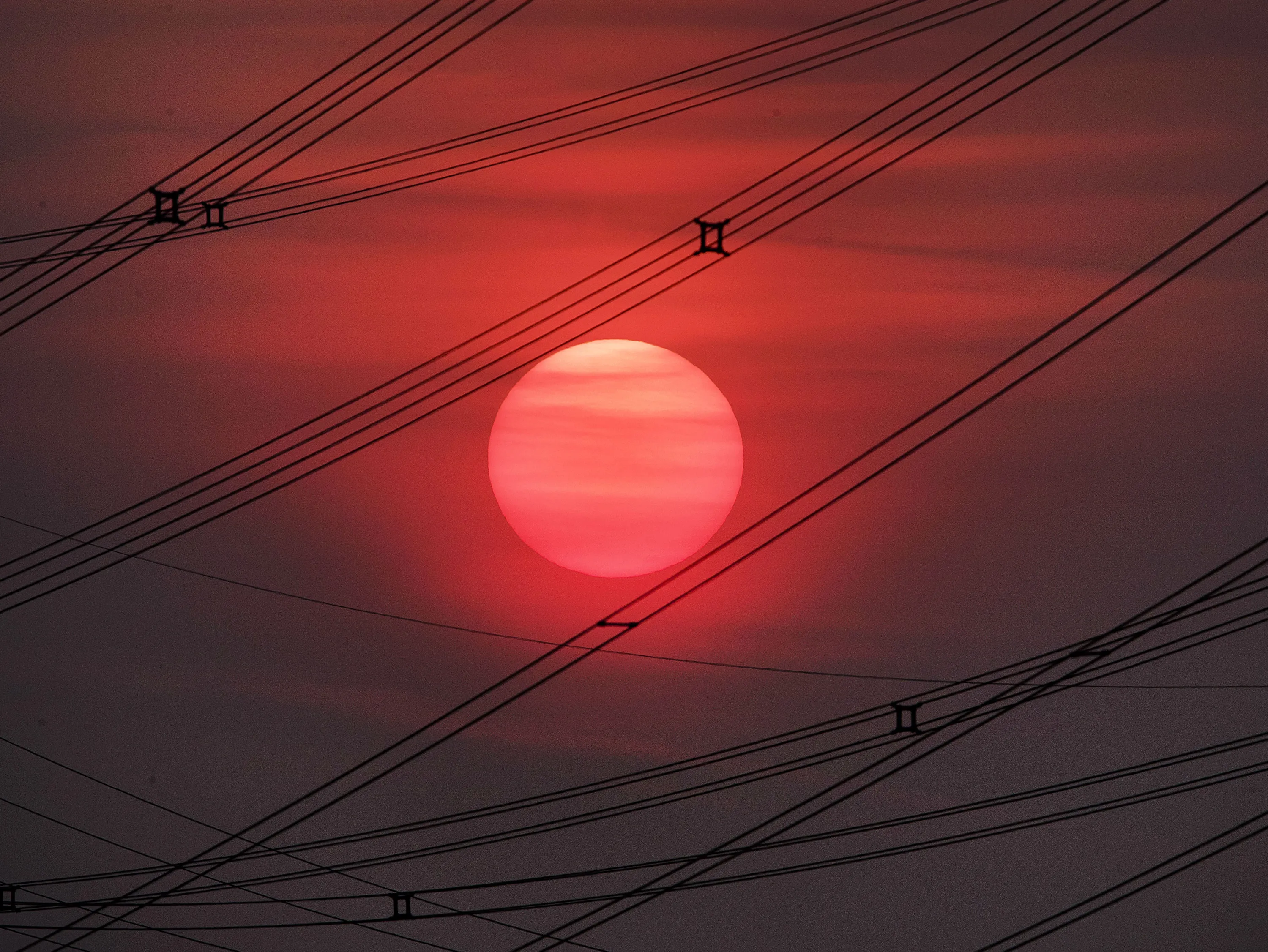 The sun rises between power lines in Frankfurt, Germany, Thursday, May 23, 2019. (Photo by Michael Probst/AP Photo)