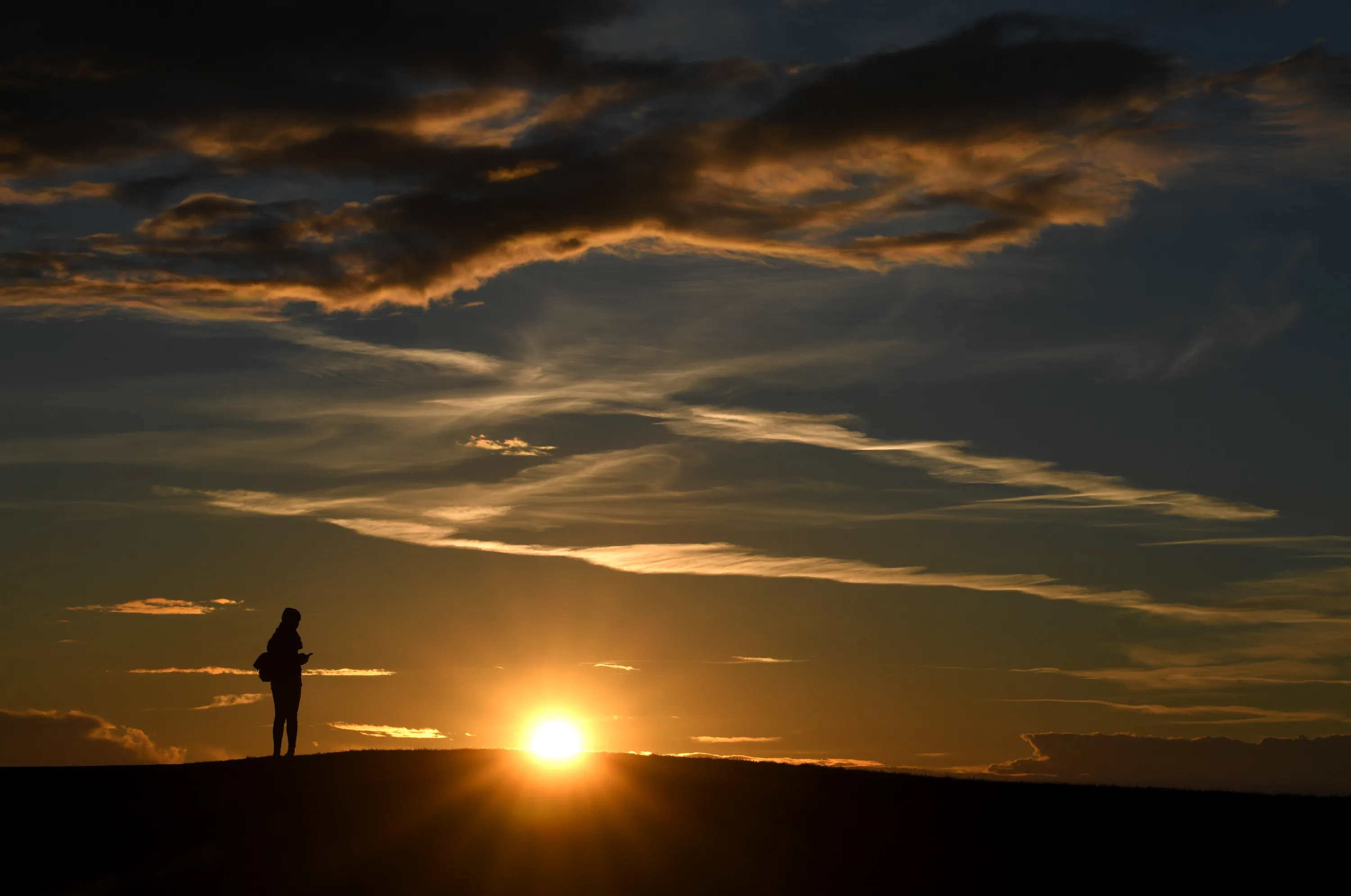 A woman watches the sunset in the Olympic park in Munich, southern Germany, after a cold day on March 18, 2019. (Photo by Christof Stache/AFP Photo)