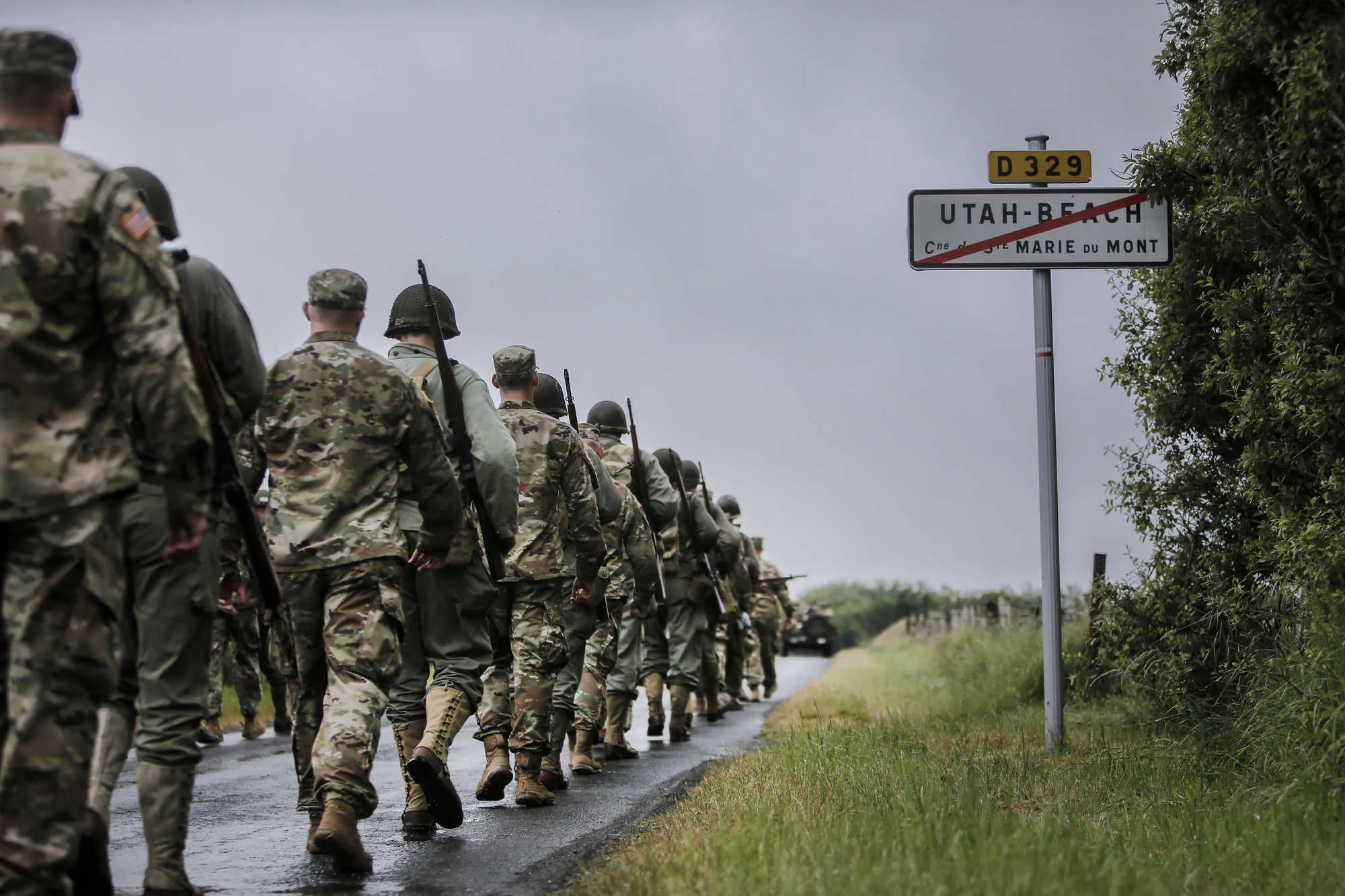 World War II enthusiasts and members of the US Army 4th Infantry Division march toward Utah Beach near Saint-Marie-du-Mont, Normandy, France, Tuesday, June 4, 2019. France is preparing to mark the 75th anniversary of the D-Day invasion which took place on June 6, 1944. (Photo by Rafael Yaghobzadeh/AP Photo)