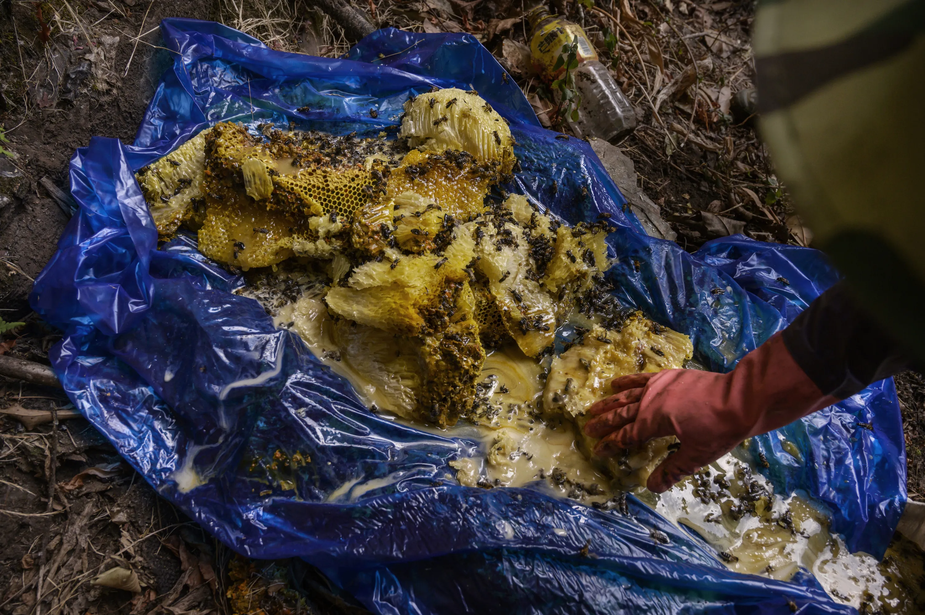 A Chinese ethnic Lisu honey hunter gathers fresh wild cliff honey in a tarp after collecting it from hives in a gorge on May 10, 2019 near Mangshi, in Dehong prefecture, Yunnan province China. (Photo by Kevin Frayer/Getty Images)