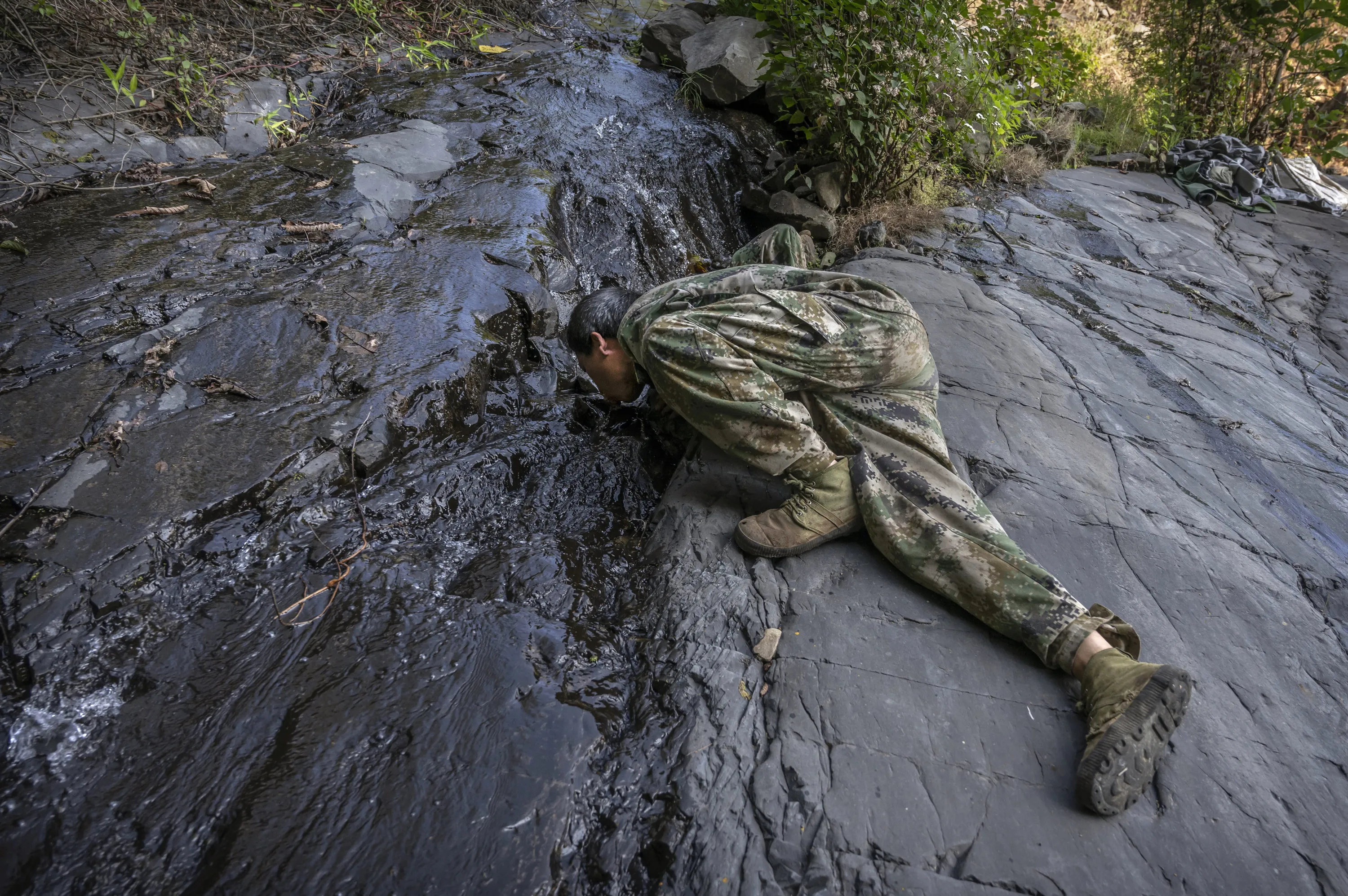 Chinese ethnic Lisu honey hunters Ma Yongde takes a drink from a stream after gathering wild cliff honey from hives in a gorge on May 31, 2019 near Mangshi, in Dehong prefecture, Yunnan province China. (Photo by Kevin Frayer/Getty Images)