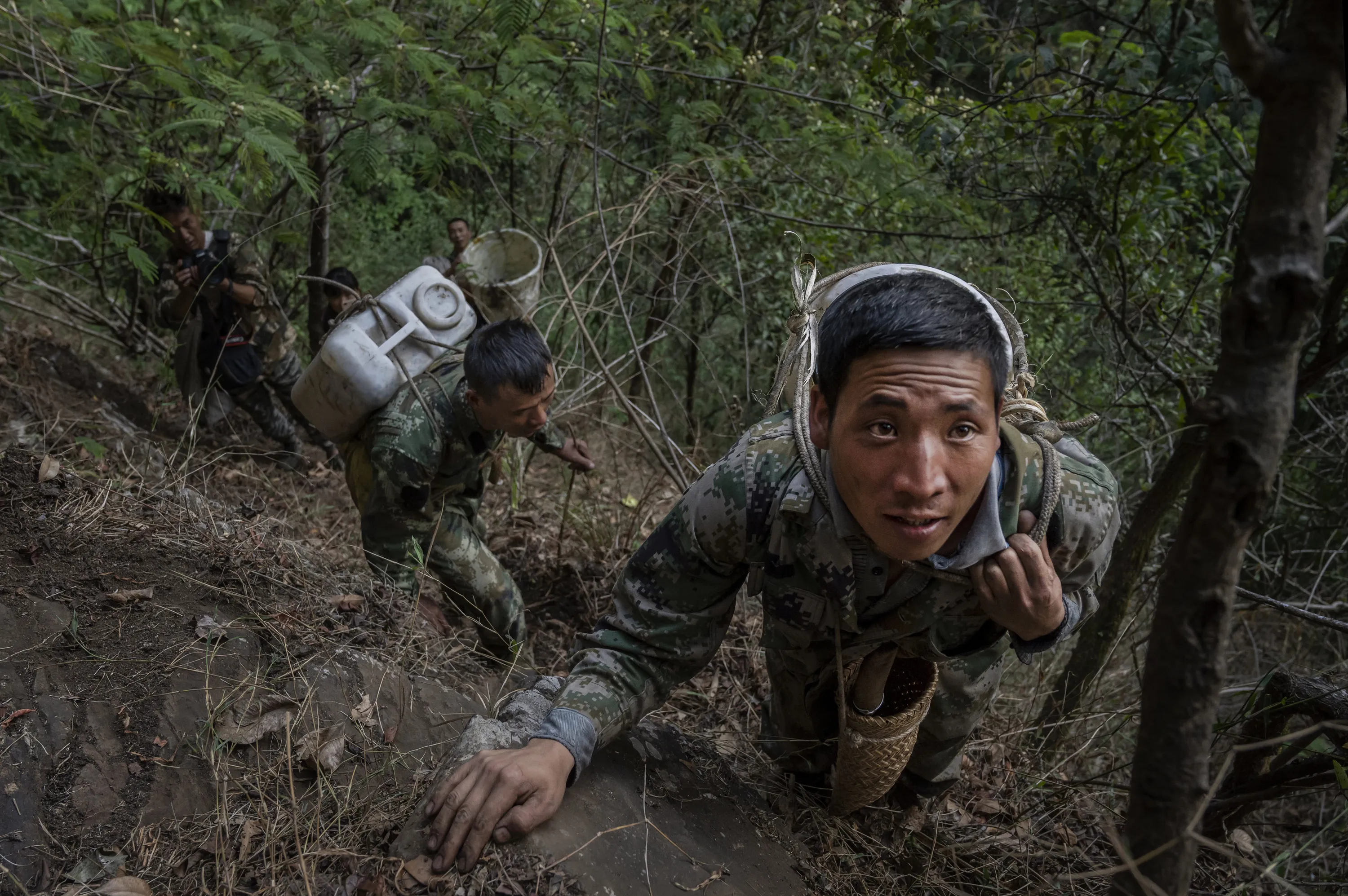 Chinese ethnic Lisu honey hunter Ma Yongde,right, and Mi Qiaoyun carry honey on thier backs as they climb out after gathering wild cliff honey from hives in a gorge on May 10, 2019 near Mangshi, in Dehong prefecture, Yunnan province China. (Photo by Kevin Frayer/Getty Images)