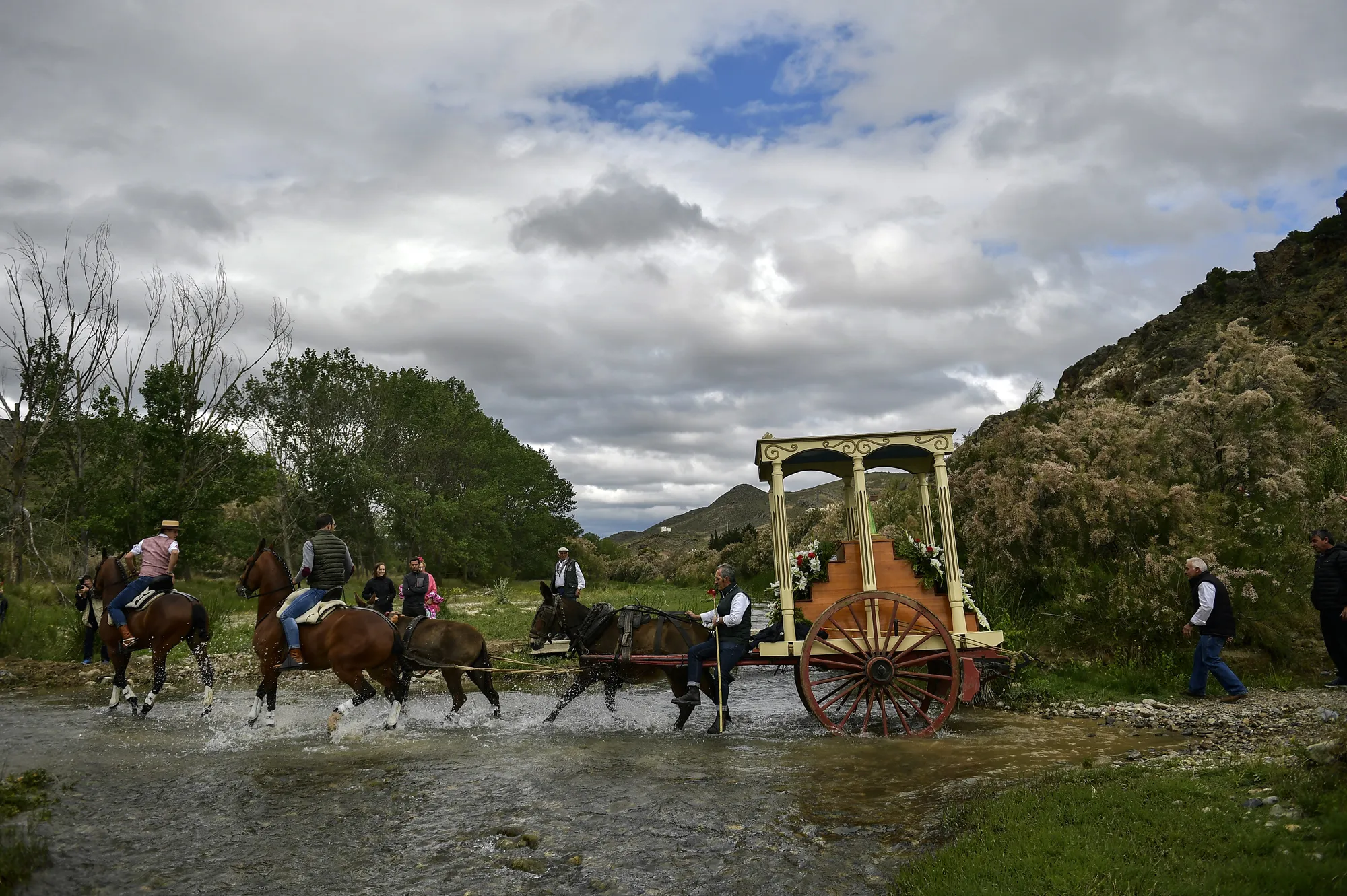 Devotees of the Rocio Virgin cross a river as they take part in the “Romeria de El Rocio” in the countryside outside Fitero, northern Spain, Saturday, May 25, 2019. Fitero celebrates its 19th edition of the pilgrimage of the Virgin El Rocio, a small carved wooden statue of the Virgin and Child, of which the only carved parts are the face, hands, and the Christ child, with dances and procession. (Photo by Alvaro Barrientos/AP Photo)